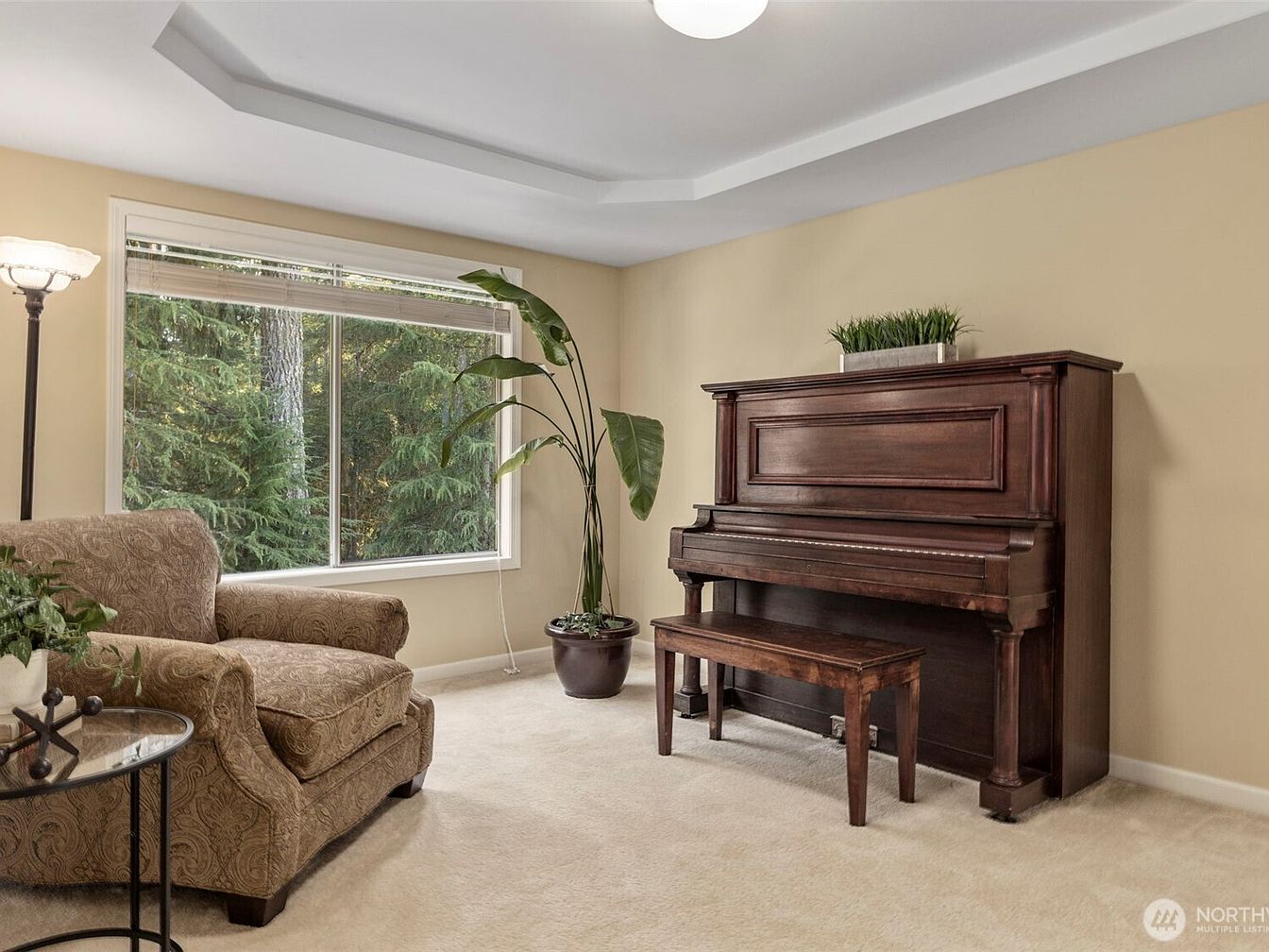 This cozy music nook features a rich, dark wood upright piano paired with a matching bench, creating a warm focal point against soft beige walls. The plush, patterned armchair nearby invites relaxation, complemented by a round glass side table with a metal frame holding a decorative plant. A large window floods the space with natural light, showcasing verdant greenery outside and enhancing the serene ambiance. A tall floor lamp in the corner adds softness to the lighting, while a large potted tropical plant brings a lively touch of nature inside. The light carpet and tray ceiling add subtle elegance to this inviting corner.