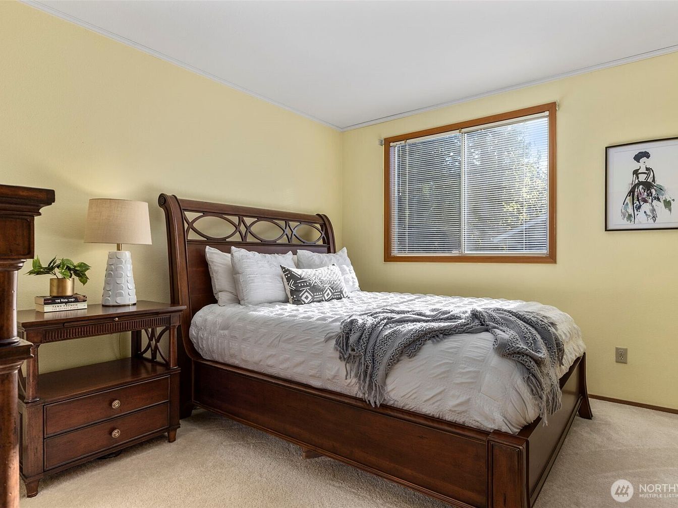 This cozy bedroom features a classic wooden bed frame with elegant carvings, complemented by a nightstand of similar dark wood finish. The soft yellow walls create a warm and inviting atmosphere, harmonizing with the neutral beige carpet underfoot. Bedding is primarily white with textured patterns, enhanced by a folded gray knit throw and decorative pillows adding subtle contrast. A table lamp with a textured white ceramic base and a beige lampshade provides gentle lighting. A large window framed in natural wood lets in ample daylight, balanced by blinds for privacy. A framed modern art piece adorns the wall, adding a touch of personality.