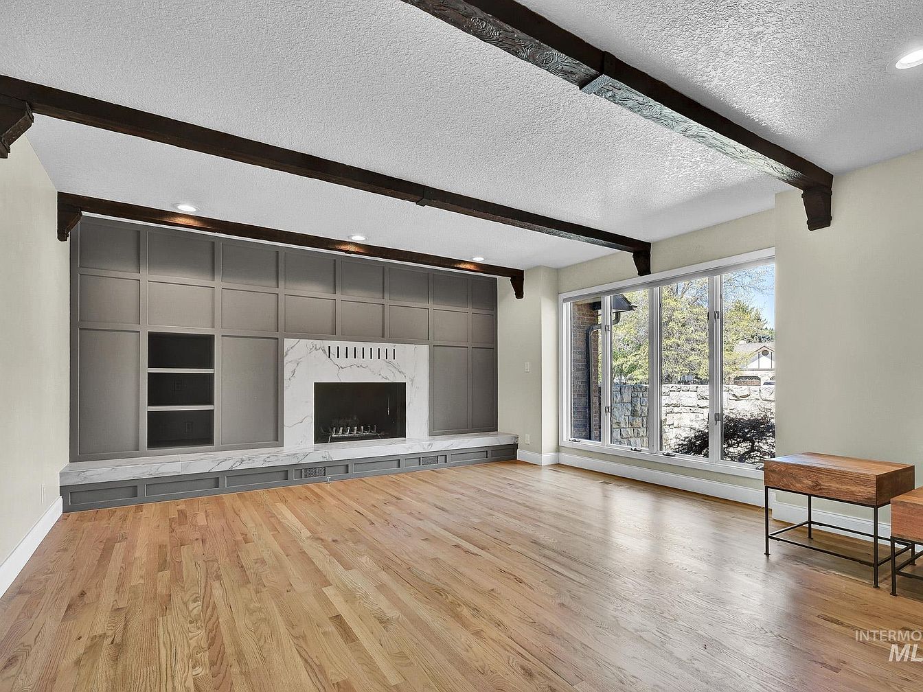 This spacious living room features a striking fireplace wall painted in a muted gray tone with panel detailing that adds depth and texture. The fireplace surrounds a white marble slab that extends along the base, providing an elegant contrast against the muted background. Exposed dark wooden beams run across the white textured ceiling, enhancing the rustic yet refined atmosphere. The light hardwood floor gleams warmly under the natural light streaming through large, floor-to-ceiling windows, offering a view of the exterior stone wall and greenery. Minimalist wooden furniture with metal accents sits to one side, complementing the room’s modern and clean aesthetic.