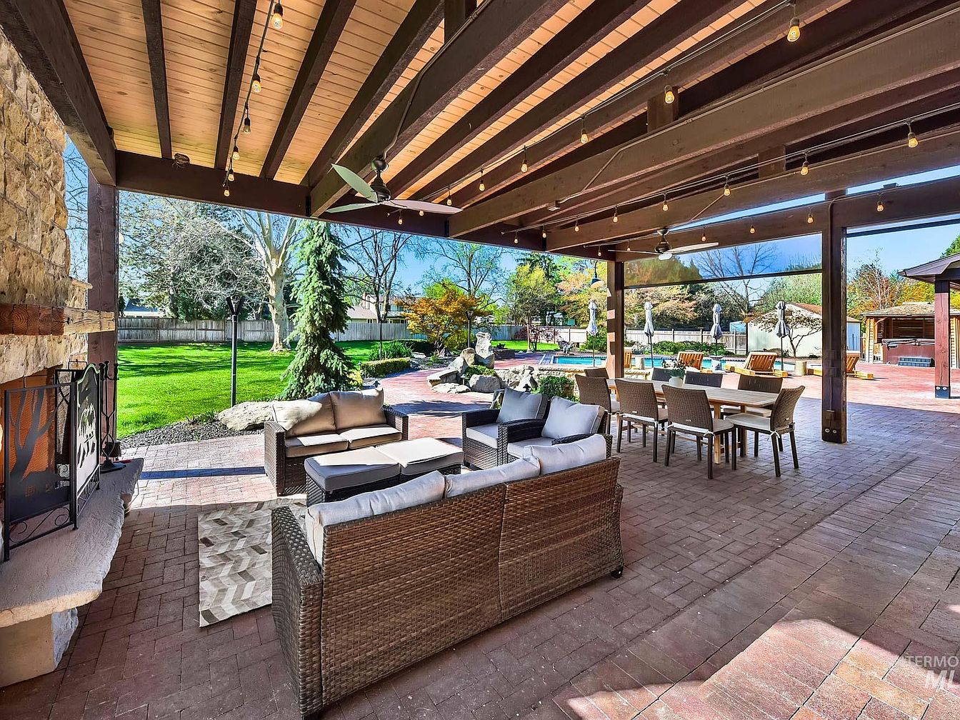 This spacious covered patio features warm wooden beams and planks overhead with string lights creating a cozy, inviting ambiance. A ceiling fan helps circulate air in the open, sheltered environment. The seating arrangement includes woven rattan-style furniture paired with cushioned seats in neutral tones, enhancing comfort and style. To the left, a stone fireplace adds rustic charm and warmth for cool evenings. The brick flooring extends seamlessly into the open backyard, integrating the outdoor living space with the lush green lawn and mature trees beyond, along with a pool ideal for both relaxation and entertaining guests.