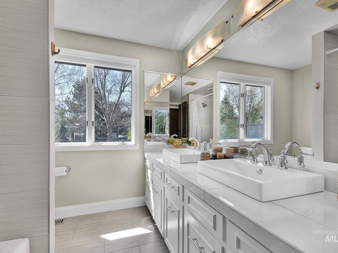 This bathroom features a sleek, modern vanity with an extended white countertop and dual sinks, each with polished chrome faucets. The cabinetry below is painted white, offering a clean, bright look with brushed metal handles contributing to the contemporary style. Above the vanity, a large mirror spans the entire length, flanked by streamlined, frosted light fixtures that provide ample illumination. Pale green walls add a subtle, refreshing touch of color, complementing the neutral-toned floor tiles that mimic the look of natural wood. Abundant natural light enters through two large, white-framed windows, enhancing the fresh, airy ambiance of this space.