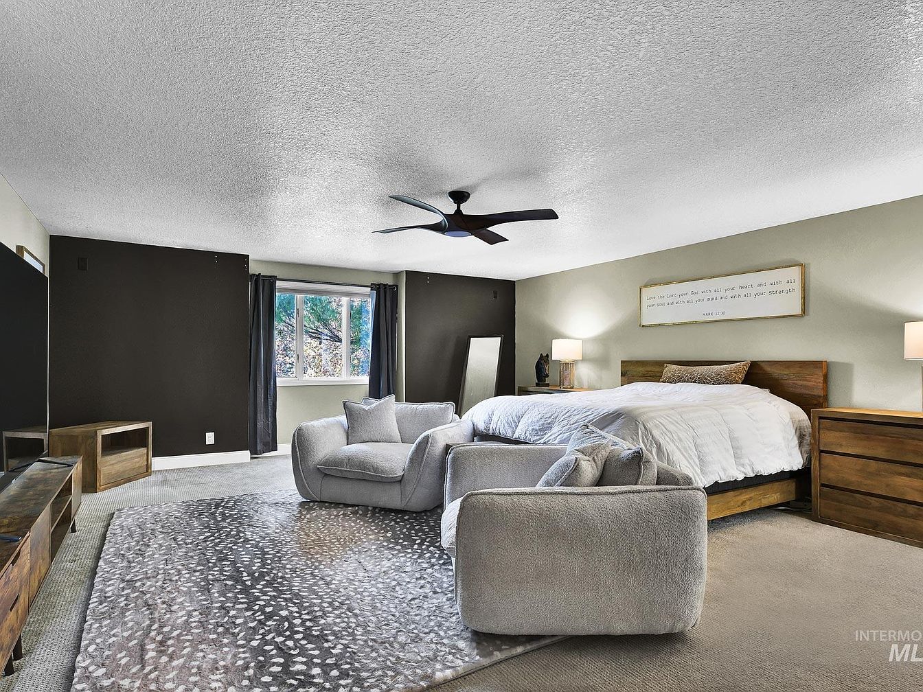 This spacious master bedroom features a calming neutral palette with soft gray walls and darker accent walls framing the window, adding depth and contrast. The centerpiece is a large wooden bed with white bedding, complemented by two matching wooden nightstands, each topped with a modern lamp. In front lies a cozy seating area with two plush, oversized armchairs in a light, textured fabric, arranged on a large patterned area rug with subtle animal print motifs. A sleek black ceiling fan adds a contemporary touch, while a full-length mirror leans casually beside the window, enhancing natural light. The layout promotes both relaxation and functionality in a tranquil, well-coordinated design.