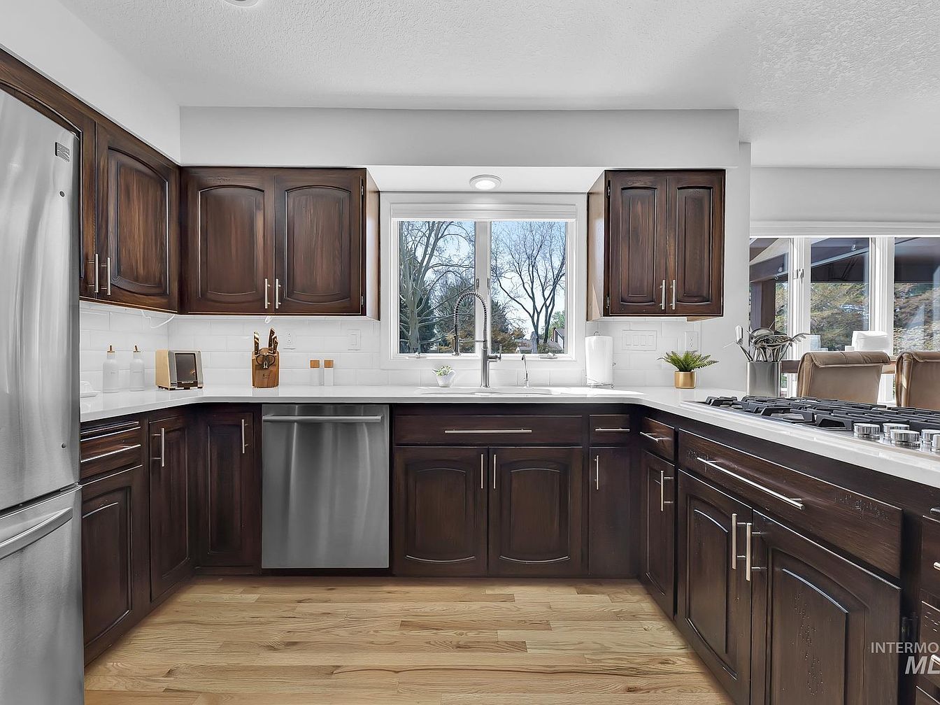 This kitchen features a U-shaped layout with rich dark wood cabinetry providing ample storage. The stark white countertops and matching white subway tile backsplash create a fresh contrast against the cabinets. Stainless steel appliances, including a refrigerator, dishwasher, and gas stove, add a modern feel. A large window centered above the sink invites natural light and offers a serene outdoor view. The light hardwood flooring warms the space, while brushed metal hardware and fixtures give a contemporary touch. The adjacent seating area visible to the right suggests an open concept design blending kitchen and living spaces.