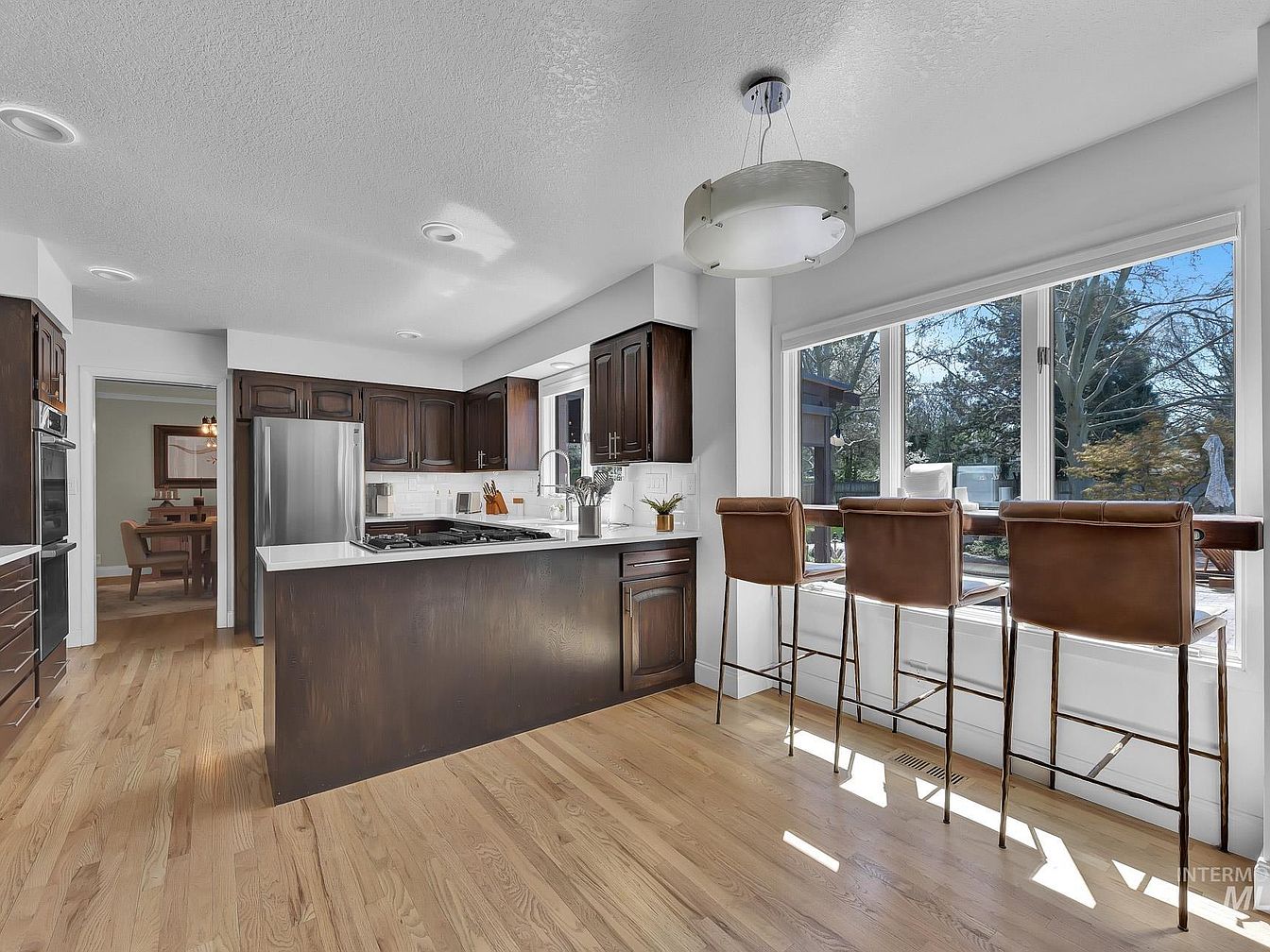 This bright kitchen features dark wood cabinetry and a large island with a white countertop, incorporating a built-in stovetop. The floor is a warm, natural wood that contrasts elegantly with the white walls and ceiling. A row of three tall leather bar stools lines the built-in bar area in front of a wide window, inviting casual dining with abundant natural light and scenic views of a leafy backyard. Stainless steel appliances add a modern touch, while recessed lighting and a contemporary round pendant light above enhance the space’s welcoming and functional atmosphere.