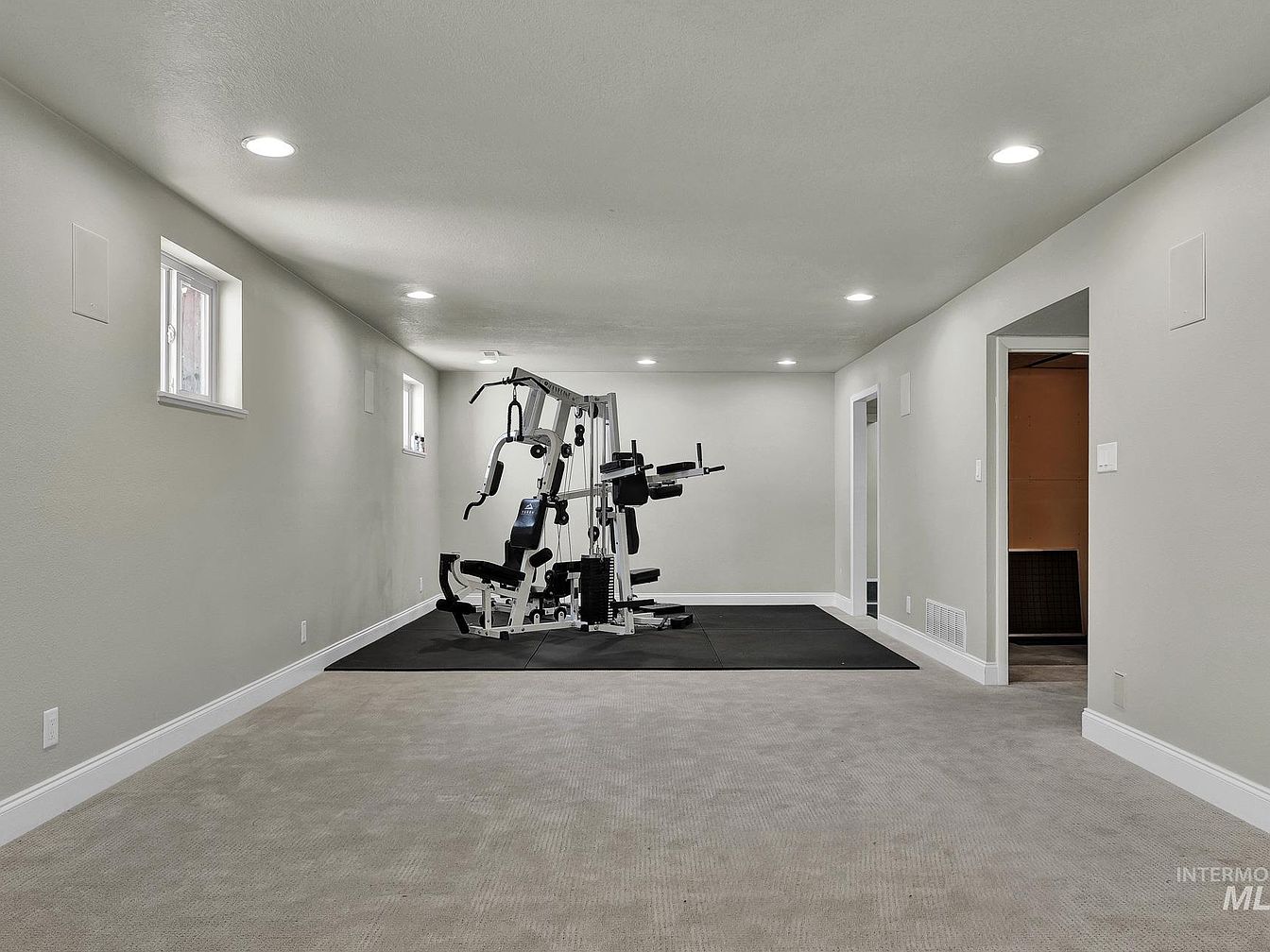 This spacious home gym features a long rectangular layout with soft gray carpeting throughout the floor, transitioning to a black exercise mat under the multi-functional weight machine. The walls and ceiling are painted in a serene, light gray tone that complements the overall minimalist aesthetic. Recessed ceiling lights provide bright, even illumination, while small high-set windows along one side wall allow natural light to filter in subtly. White baseboards outline the space neatly, and two open doorways lead to adjacent rooms, adding to the open yet functional feel of this private workout area.