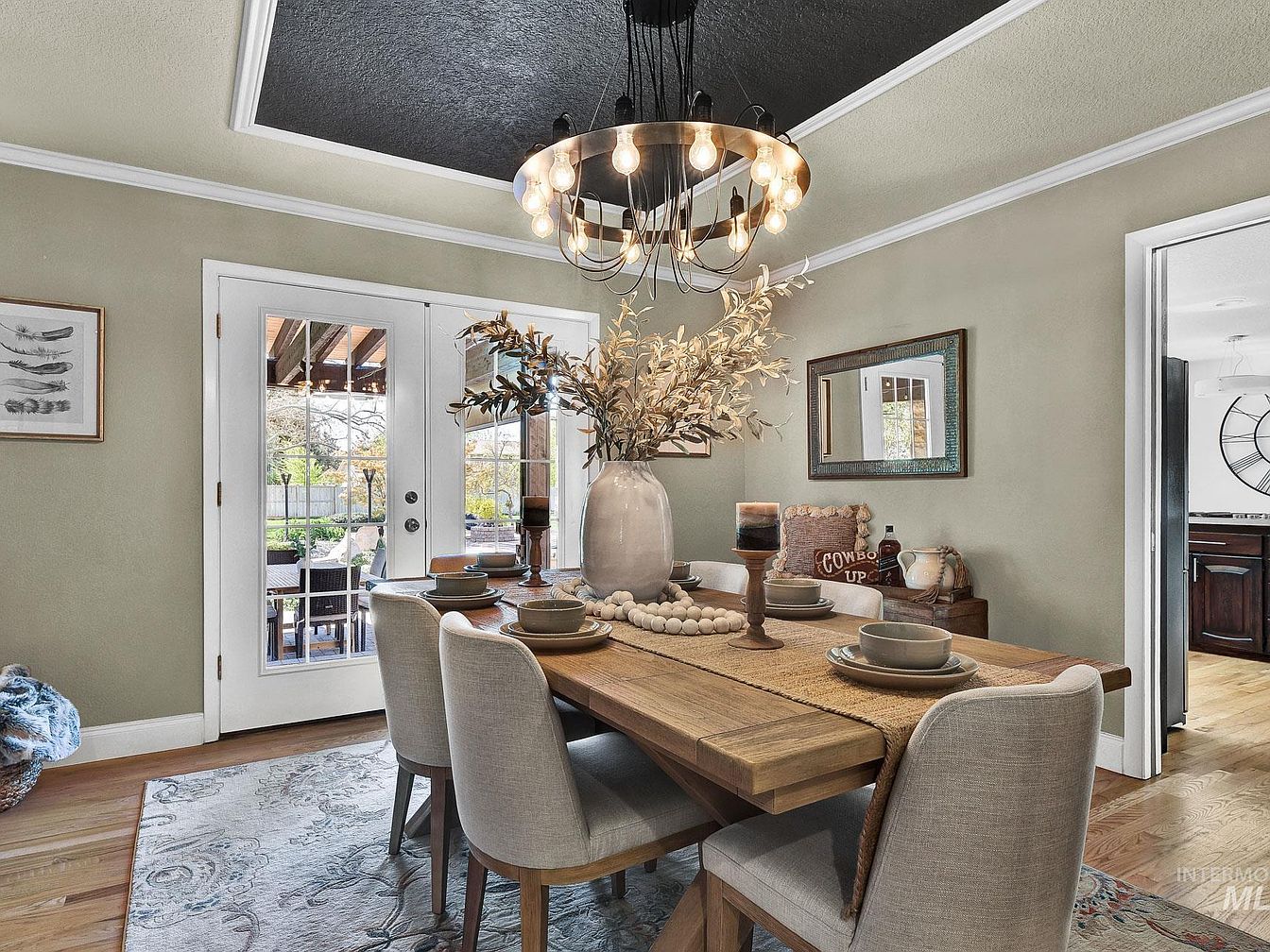 This dining area features a warm, inviting atmosphere with soft sage green walls contrasted by crisp white trim and a dramatic black tray ceiling centerpiece. The solid wood rectangular table is complemented by six cushioned beige upholstered chairs, providing comfort and style. A rustic burlap table runner, a large white ceramic vase filled with natural branches, and two wooden candle holders add an organic touch to the table setting. A circular chandelier with exposed bulbs hangs centrally, casting a warm glow. French doors lead outside, enhancing natural light and inviting an airy, connected feel to the adjoining outdoor space.