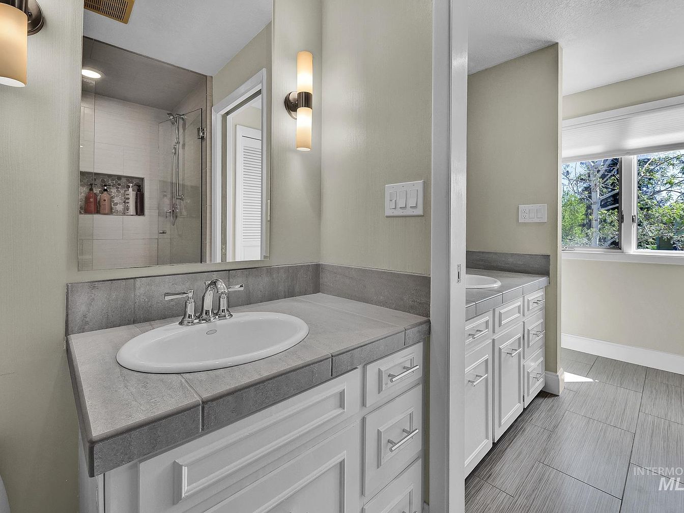 This bathroom features a clean, modern design with a double vanity separated by a partial wall, offering privacy and functionality. The countertops are made of smooth, gray tiles that contrast elegantly with the crisp white cabinetry below, which is accented by sleek, silver handles. Soft sage green walls provide a calming backdrop, complemented by ample natural light streaming through large windows that brighten the space. The wall-mounted light fixture next to the mirror adds a warm, inviting glow, while the tiled floor extends seamlessly, enhancing the room’s spacious and tranquil atmosphere. The glimpse of a tiled shower with built-in niches adds practical storage and subtle texture variation.