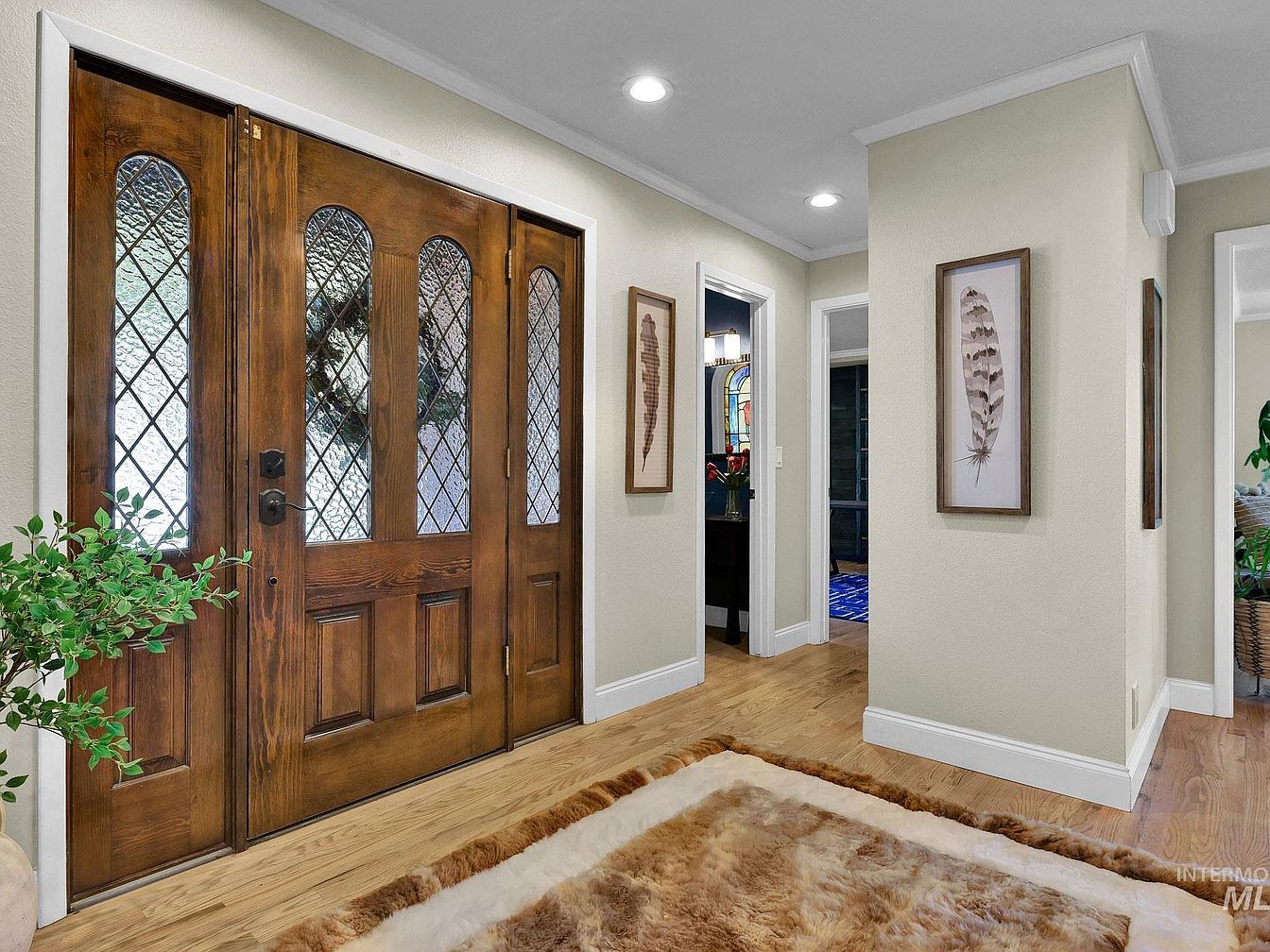 The entryway features a striking solid wood front door with decorative diamond-patterned frosted glass panels that allow natural light while maintaining privacy. The floor is polished hardwood in a warm tone, complemented by a plush area rug in shades of beige and brown, adding texture and coziness. The walls are painted a soft sage green, creating a calm atmosphere. Simple white baseboards and crown molding frame the space. On the walls, minimalist framed feather art adds a natural, rustic touch. Recessed ceiling lights provide bright, even illumination, highlighting the clean and inviting design of the foyer.