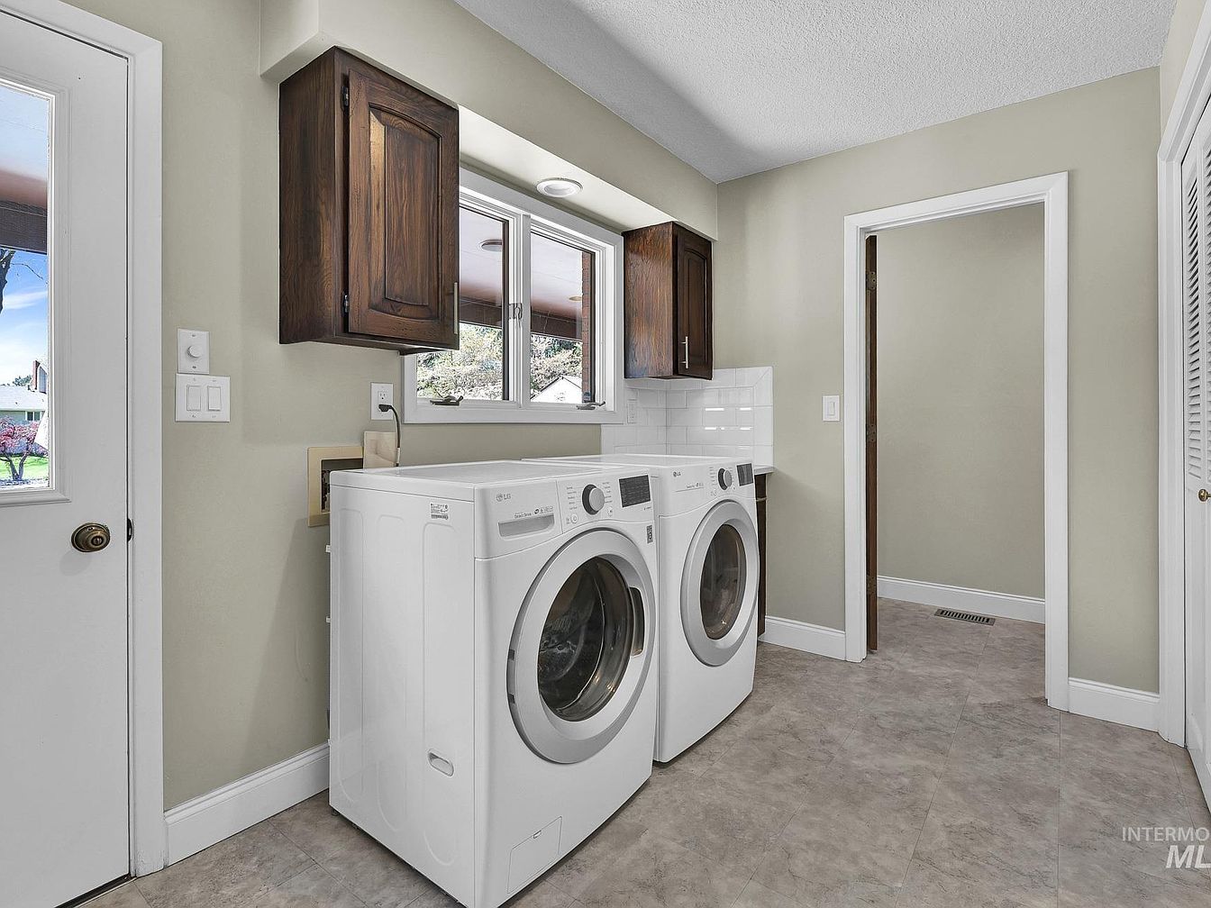 This laundry room features a clean and practical layout with two front-loading white washers and dryers side by side. The walls are painted in a soft sage green, creating a calm and welcoming atmosphere. Above the appliances, dark wood cabinets with classic panel doors provide ample storage, contrasting elegantly with the lighter wall color. A window situated between the cabinets allows natural light to brighten the space. The floor is covered with neutral-toned tile that complements the overall palette. White baseboards and trim add crisp definition to the room, while the nearby door and hallway offer easy access to other areas of the home.