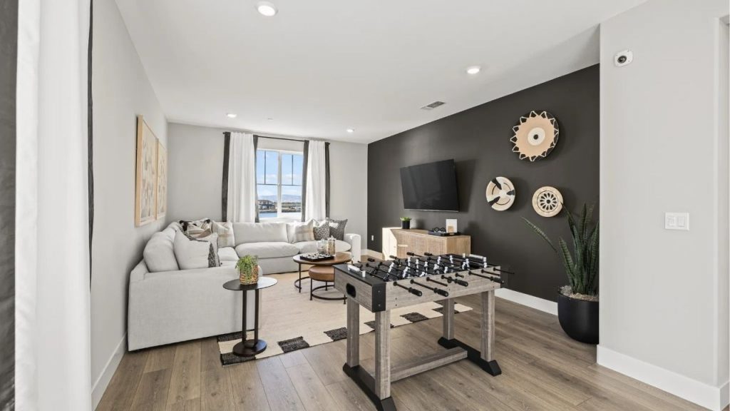 A welcoming blend of comfort and style defines this game-ready retreat. Anchored by a plush L-shaped sofa, the room offers ample seating beneath a sunlit window framed by soft drapes. A bold accent wall adds depth behind the mounted TV and sculptural decor. Warm wood tones from the floors and foosball table ground the space, while layered textures and greenery bring it to life. Ideal for casual lounging or friendly competition.