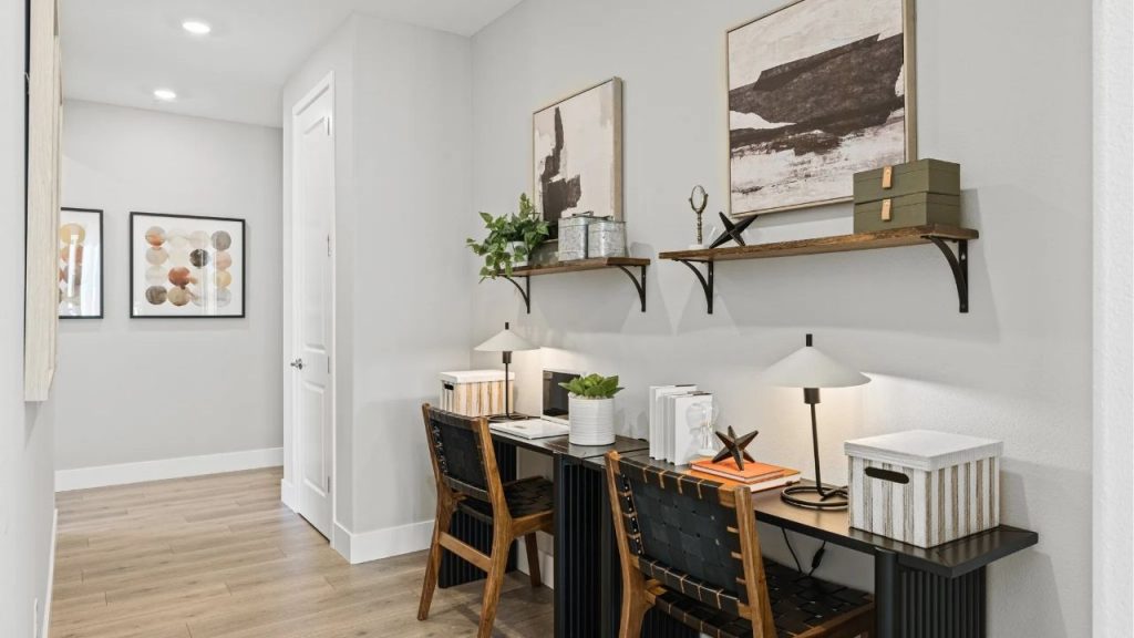 Tucked neatly into a hallway alcove, this dual workstation blends practicality with charm. Black woven chairs pair effortlessly with the streamlined desk, while warm wood shelving above offers space for curated décor and essentials. Layered textures and abstract art introduce personality, and soft lighting from twin lamps ensures a cozy, focused ambiance. A smart, serene setup for work or creativity.