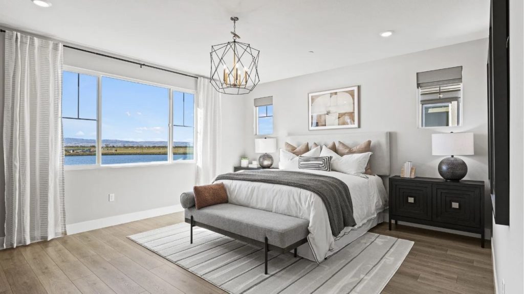 This airy bedroom is a peaceful retreat, framed by expansive windows that showcase tranquil water views. Soft neutrals dominate the palette, while textured throw pillows and a ribbed bench add subtle dimension. A sculptural chandelier provides a modern focal point overhead, complementing the clean lines of the upholstered bed and bold nightstands. Perfectly balanced, the space feels both refined and restful.