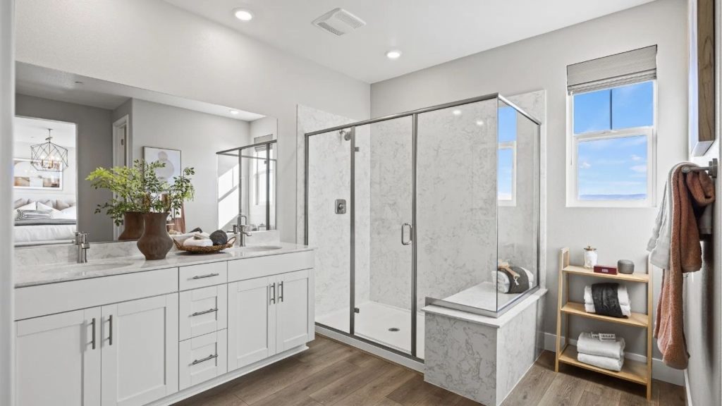 Bright and inviting, this primary bath exudes calm with its clean palette and sleek finishes. White shaker cabinetry pairs seamlessly with marble countertops and chrome fixtures, while a glass-enclosed shower features matching marble walls for a cohesive look. Wide-plank wood flooring adds warmth underfoot. A simple wood shelf and woven accents bring in natural texture, striking a perfect balance between elegance and comfort.