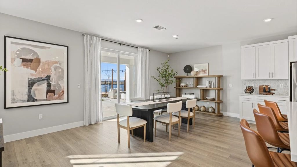 This bright and inviting dining area blends contemporary elegance with natural ease. A sleek black table anchors the room, surrounded by clean-lined chairs that echo the neutral palette. Soft light filters through sheer curtains framing sliding glass doors, opening to an outdoor oasis beyond. Warm wood tones, curated shelving, and abstract artwork create a calm, balanced atmosphere perfect for everyday living or effortless entertaining.