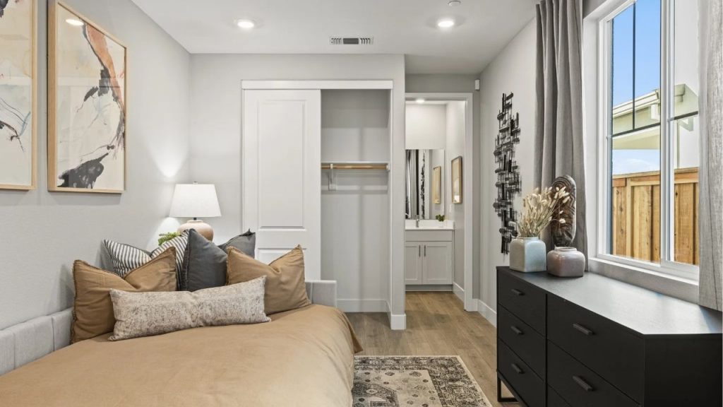 This intimate guest space pairs comfort with understated charm. A taupe-hued daybed layered in textured pillows offers a restful escape, while abstract artwork and warm wood flooring elevate the visual appeal. Natural light filters through soft drapes, brightening the modern black dresser and curated ceramic decor. A private vanity area just beyond the closet adds function without sacrificing style.
