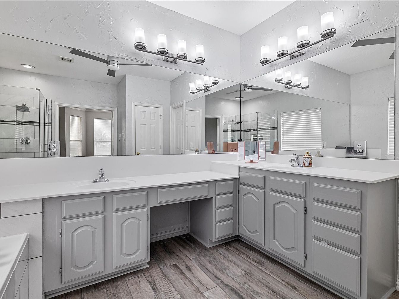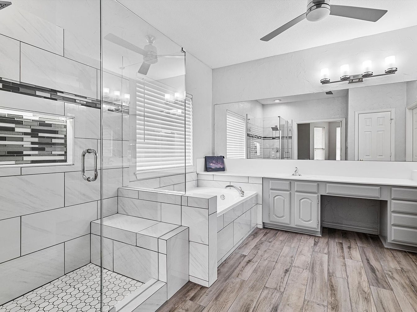 This master bathroom boasts a modern, clean aesthetic with a neutral color scheme dominated by whites and grays. The spacious shower is enclosed in clear glass with white marble-look tiles accented by a horizontal strip of dark glass mosaic tile. Inside the shower, hexagonal floor tiles add subtle texture. Adjacent to the shower is a built-in bathtub, also clad in the same marble-look tile, featuring a tiled step for easy access. A long vanity with a wide countertop and under-mounted sink runs along the opposite wall, painted in soft gray cabinetry. The large mirror above reflects light from the window covered with white blinds, and contemporary brushed nickel fixtures and a sleek ceiling fan complete the look. The faux wood plank flooring adds warmth and contrast to the otherwise cool-toned space.