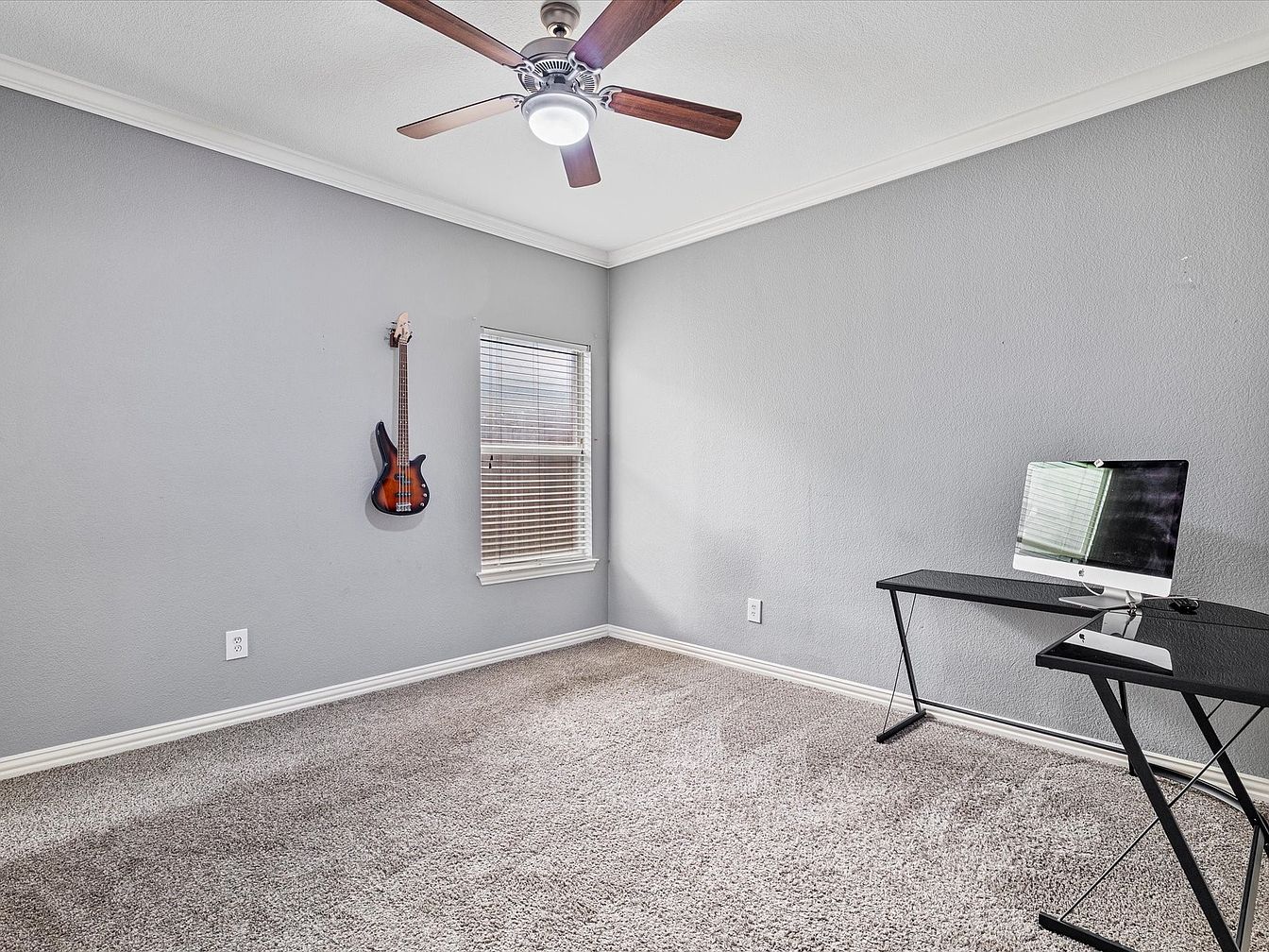 This quiet, compact corner of a home is styled as a minimalist home office with music flair. Soft gray walls paired with white crown molding create a clean, neutral backdrop. Plush beige carpeting adds warmth and comfort underfoot. Natural light filters through a window with white blinds, enhancing the calm atmosphere. Furnishing is sparse: a sleek black glass corner desk holds a modern computer, while an electric bass guitar mounted on the wall hints at a creative occupant. A ceiling fan with wooden blades and a central light adds functional charm without overpowering the simplicity of the space.