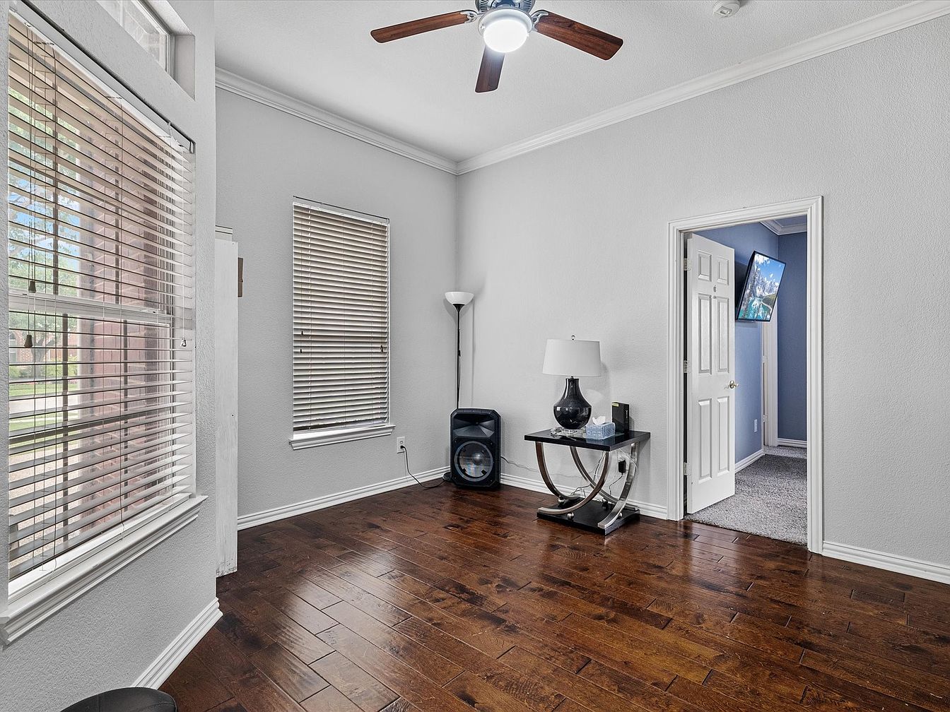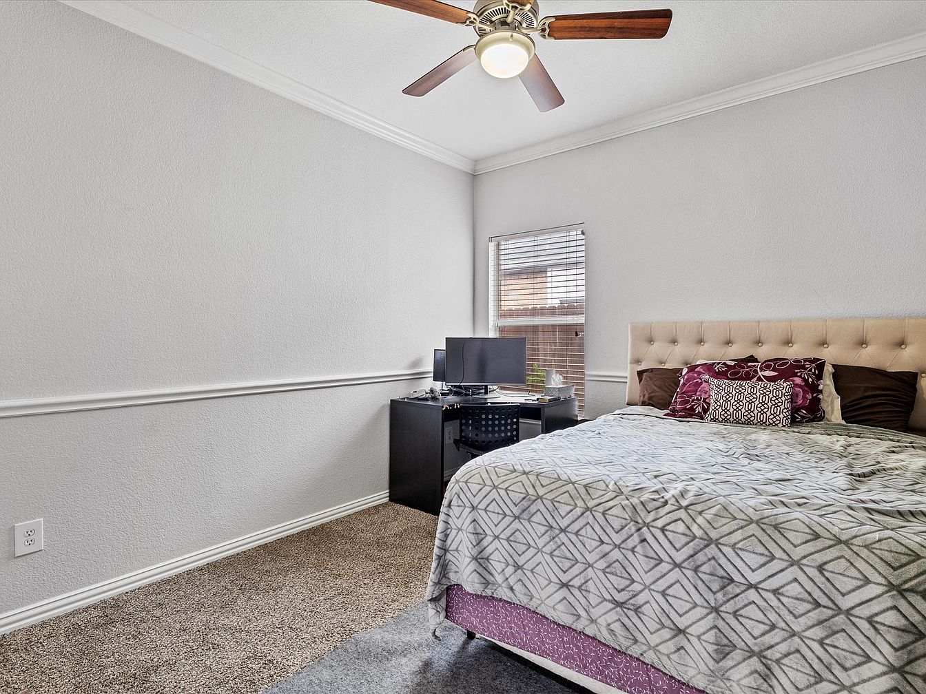 This cozy bedroom features a neutral color palette with soft gray walls accented by crisp white trim and crown molding, creating a clean and calming atmosphere. The plush beige carpet adds warmth underfoot. A comfortable bed with a tufted, light beige headboard anchors the space, dressed with a geometric patterned comforter and decorative pillows in shades of burgundy and brown. A compact black desk with dual monitors is positioned near a window with white blinds, offering a quiet workspace with natural light. The ceiling fan with wooden blades adds both function and subtle elegance.