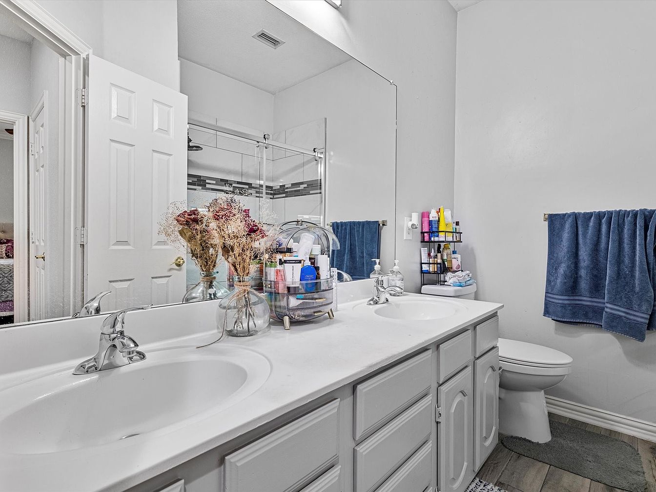The bathroom features a spacious double-sink vanity with sleek white countertops and matching cabinetry offering abundant storage. A large mirror stretches across the entire vanity wall, enhancing the sense of openness and light. Soft gray walls provide a neutral, calming backdrop that complements the white fixtures. On the counter, a clear vase with dried flowers adds a touch of natural decor alongside organized toiletry containers. The flooring is wood-textured, adding warmth and contrast to the predominantly white and gray palette. Accessories include navy blue towels on a wall-mounted rack and a tidy storage rack near the toilet, blending functionality with understated style.