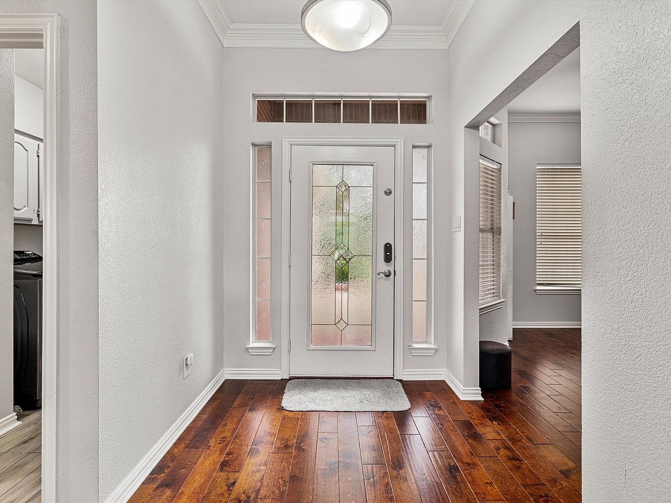 This entryway features a crisp white front door with decorative frosted glass panels, flanked by narrow vertical glass windows that allow natural light to gently filter in. Above the door, a transom window adds both architectural interest and extra brightness to the space. The walls are painted a clean, bright white, enhancing the stage-like simplicity and openness. The warm, rich-toned hardwood floor contrasts beautifully with the white walls, creating a welcoming ambiance. The doorway leads to a glimpse of other rooms, framed by simple white molding, while the overall design emphasizes clarity, light, and classic elegance.