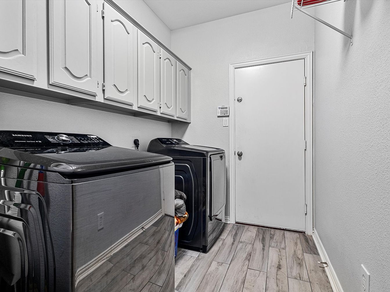 This laundry room presents a clean, functional space with sleek, modern design elements. The room features two side-by-side Samsung washer and dryer units in a glossy black finish, providing a striking contrast against the soft white walls. Above the appliances, a row of classic white paneled cabinets offers generous storage and adds a touch of traditional elegance. The flooring consists of light wood-look tiles with natural grain patterns, adding texture and warmth to the room. A white door with simple hardware leads out of the space, and a security panel is mounted nearby, enhancing the room’s practical layout.