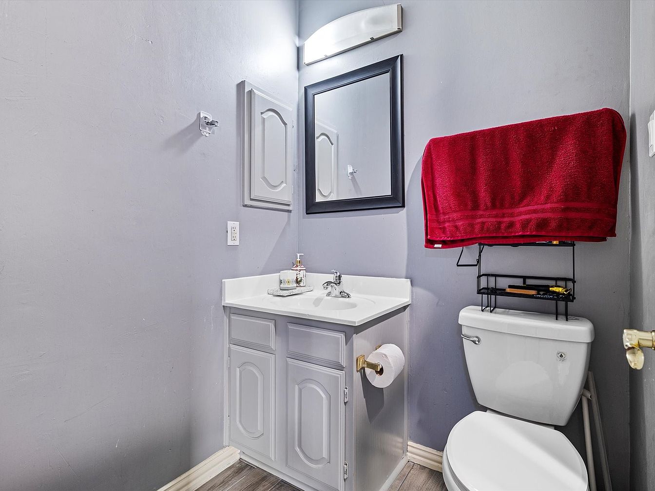 This compact bathroom features a corner vanity with classic raised-panel white cabinetry, topped with a clean white countertop and integrated sink. Above the vanity, a black-framed square mirror contrasts stylishly against soft gray walls, complemented by a sleek horizontal light fixture for bright illumination. The toilet is positioned adjacent with a minimalistic wire shelving unit over the tank, holding a bold red towel that adds a pop of color and warmth to the neutral color palette. Wood-look flooring adds subtle texture, while brass details like the towel bar and toilet paper holder offer a touch of elegance. A medicine cabinet with a matching door sits above the vanity for extra storage, maximizing the small space functionality.