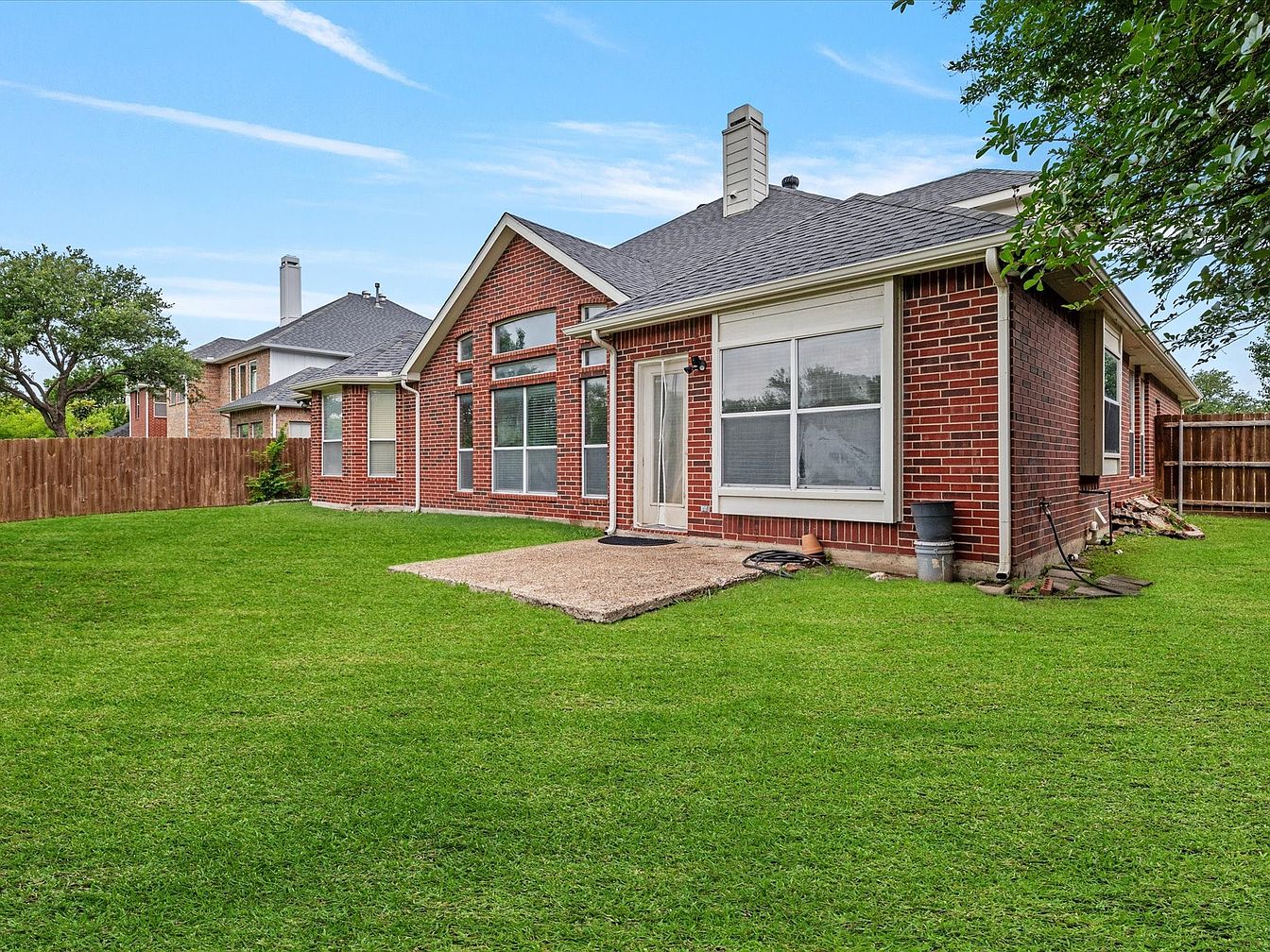 This spacious backyard features a well-maintained, lush green lawn enclosed by a wooden privacy fence, creating a private outdoor area perfect for relaxation or play. The red brick exterior of the home adds classic charm, complemented by large windows that invite natural light indoors. A small concrete patio extends from a back door, ideal for casual seating or BBQ setups. The overall design emphasizes simplicity, comfort, and functionality, with mature trees adding shade and a natural touch to this peaceful suburban outdoor space.
