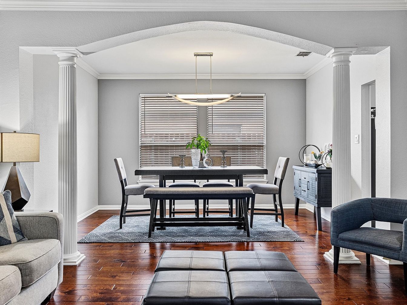 This elegant dining space features a framed architectural archway supported by two classical white columns, creating a grand entrance into the room. Natural light filters softly through twin windows with horizontal blinds, highlighting the muted gray walls that complement the warm, rich wood flooring. A large, dark wood dining table anchors the space, surrounded by cushioned chairs and a matching bench upholstered in subtle gray fabric. A contemporary linear pendant light hangs above the table, enhancing the modern yet inviting feel. Additional furnishings include a dark sideboard with decorative accents, and seating in adjacent spaces that balance comfort and style seamlessly.