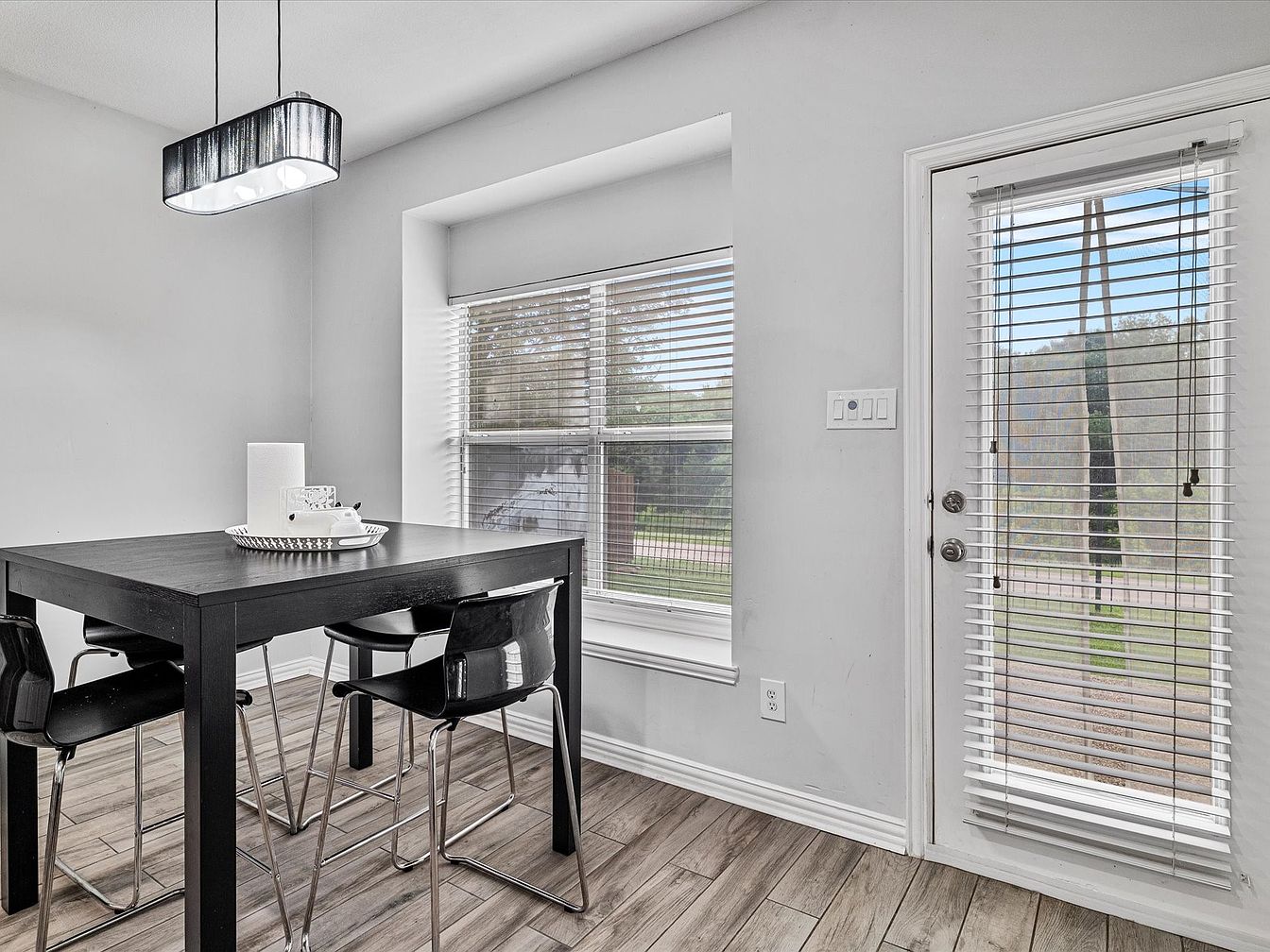 This cozy breakfast nook features a modern black rectangular dining table paired with sleek black chairs supported by metal legs, creating a minimalist yet sophisticated setting. The walls are painted a soft light gray, complementing the light wood-look tile flooring that adds warmth and texture. A large window with white horizontal blinds allows natural light to flood the space, while the adjacent glass door, also adorned with blinds, offers a seamless indoor-outdoor connection. Above the table, a contemporary black pendant light fixture provides focused illumination, enhancing the area’s inviting ambiance.