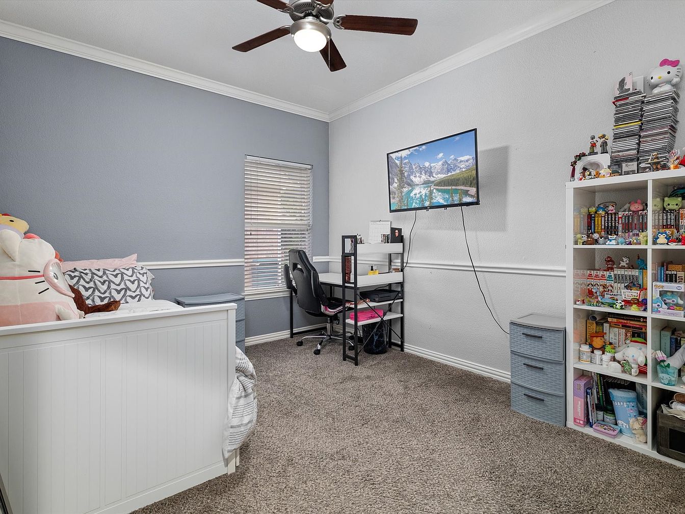 This cozy bedroom features a calming color palette with light grey and blue walls separated by a white chair rail molding, creating a subtle yet defined contrast. The soft beige carpeting enhances the warmth of the space. A white bed with plush stuffed animals adds a personal touch to the corner. Opposite the bed, a sleek black desk with a rolling chair is positioned under a wall-mounted flat-screen TV displaying a serene mountain landscape, perfect for both work and entertainment. To the right, an open shelving unit houses a vibrant collection of books, toys, and decorative items, reflecting a mix of functionality and charm. The ceiling fan with dark blades provides a modern accent to the room’s overall inviting atmosphere.