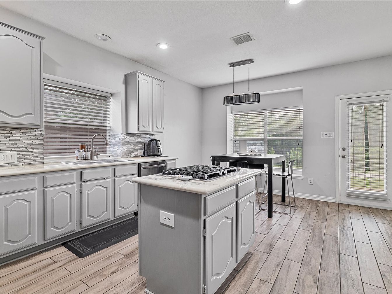 This kitchen features a soft gray and white color scheme accented by light wood-look tile flooring that stretches throughout the space. The cabinetry has a classic raised panel design in a muted gray tone, paired with sleek marble countertops. A central island with a built-in gas cooktop offers additional prep space and storage, while recessed lighting overhead provides bright, even illumination. The dining nook adjacent to the kitchen includes a dark wood table with modern metal chairs beneath a contemporary black pendant light. Large windows with blinds allow natural light to enhance the welcoming, airy atmosphere. A glass door leads outside, connecting this space seamlessly to the exterior.