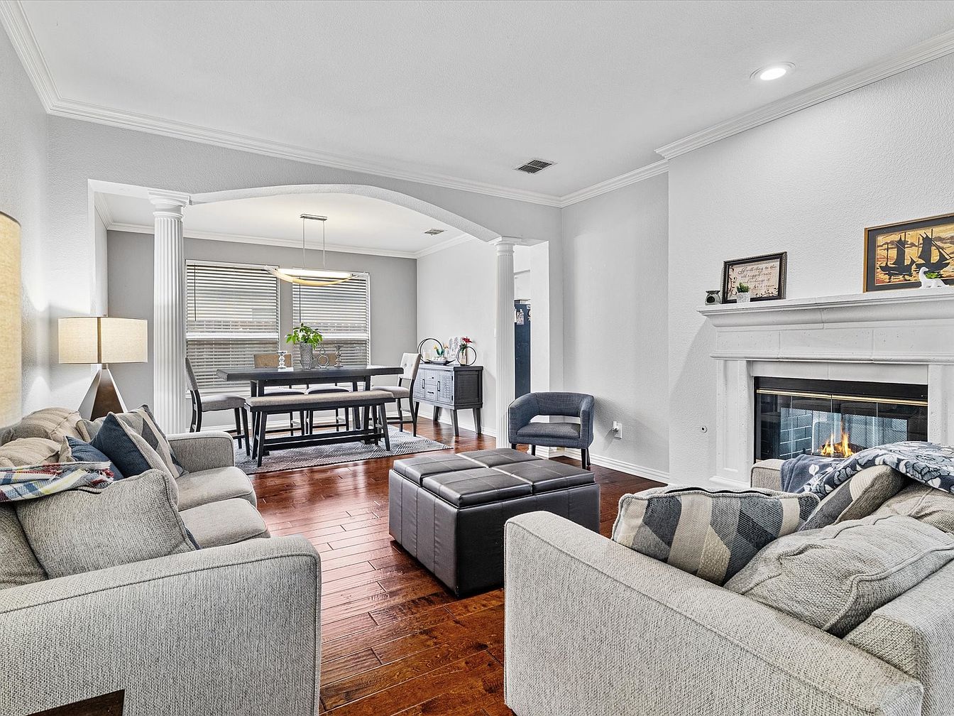 This inviting living room flows seamlessly into the dining area, highlighted by a soft archway supported by two fluted columns. Neutral light gray walls and white crown molding frame the space, contrasting beautifully with the rich, dark hardwood flooring. Comfortable gray upholstered sofas with patterned cushions center the seating area around a large, square leather ottoman. A classic white fireplace with simple decor above adds warmth and a focal point to the room. The dining space features a sleek black table paired with a bench and chairs, illuminated by a modern, curved pendant light. Ample natural light filters through the horizontal blinds, enhancing the bright, airy ambiance.