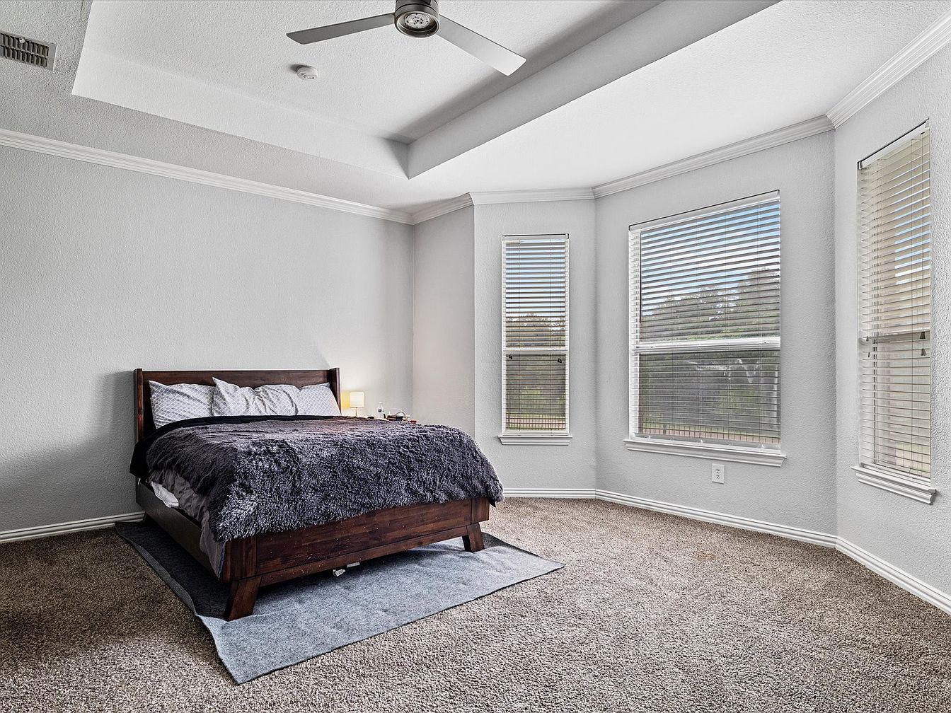 This serene bedroom corner features a spacious layout with a wooden bed frame dressed in dark, plush bedding and patterned pillows. The soft carpet adds warmth, complemented by a subdued grey and white color scheme. Large bay windows with white blinds invite natural light, creating a bright and airy atmosphere while offering scenic views outside. The ceiling has a recessed tray design with crown molding, enhancing architectural interest. A subtle ceiling fan and a small bedside lamp provide functional yet minimalist accents, emphasizing the room’s calm and uncluttered aesthetic.