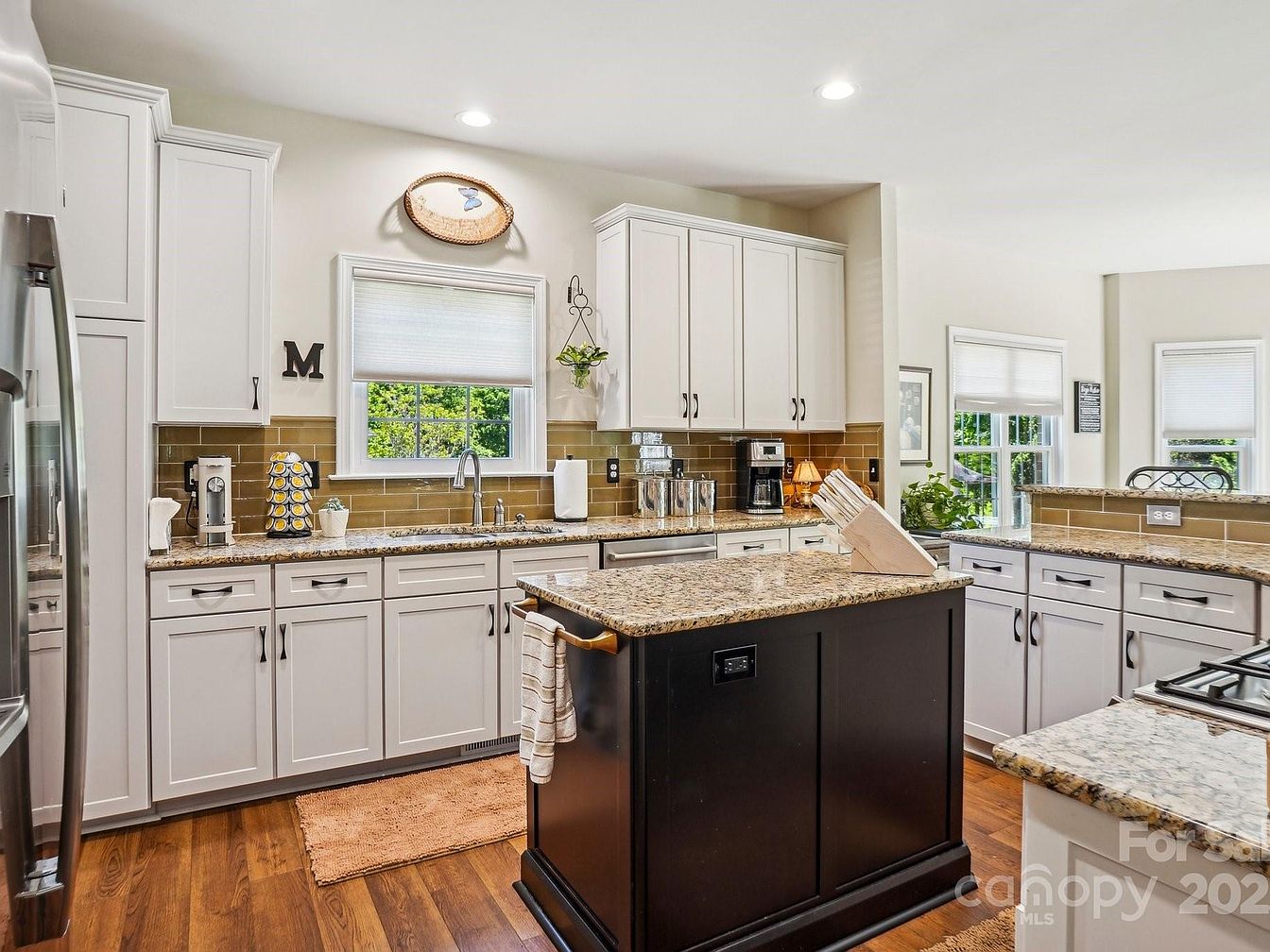 This kitchen features a spacious layout with white cabinetry and warm granite countertops that extend throughout the room, including a prominent central island painted in contrast black. The island is equipped with a towel rack and a knife block, emphasizing functionality. The backsplash is composed of glossy, muted olive-toned tiles, complementing the earthy wood flooring. Stainless steel appliances, including a fridge and built-in stove, add modernity, while handles and fixtures maintain a classic black finish. Multiple windows allow ample natural light, enhancing the open and welcoming atmosphere with subtle decorative touches and practical storage solutions.