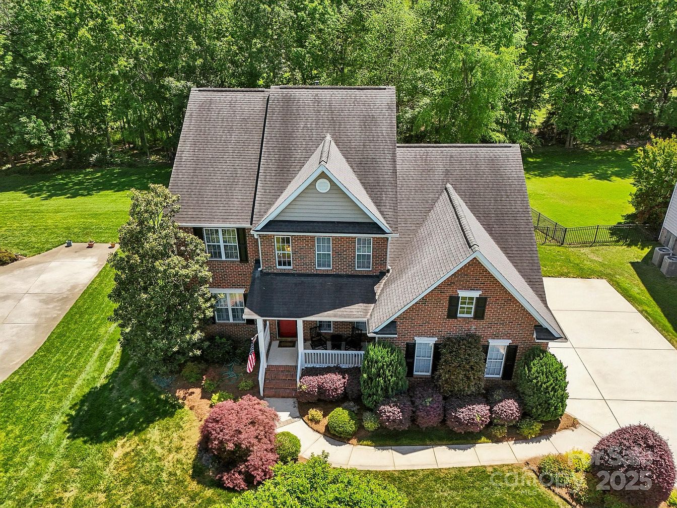 This charming two-story brick home features a classic architectural style with a steeply pitched roof and clean white trim. The front porch, with white railings and space for seating, creates a welcoming entrance. Symmetrical windows with black shutters add to the traditional aesthetic. The landscaping is meticulously maintained with vibrant bushes and a variety of shrubs lining the front walkway, enhancing curb appeal. A lush green lawn and mature trees provide privacy and a natural backdrop, while the spacious concrete driveway leads to the home’s side, offering ample parking space.