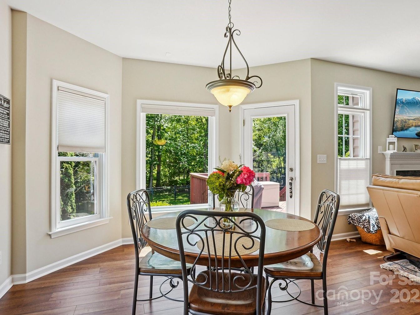 This cozy dining nook features a round wooden table with a glass top and intricate wrought iron chairs that add an elegant touch. Positioned adjacent to large windows and a glass door, the space is bathed in natural light while providing a clear view of the lush green backyard deck. The soft beige walls and warm wood flooring create a soothing, neutral palette that complements the earthy tones of the furniture. A classic pendant light fixture hangs overhead, enhancing the welcoming ambiance and crafting a perfect spot for casual meals or morning coffee while enjoying the scenic outdoors.