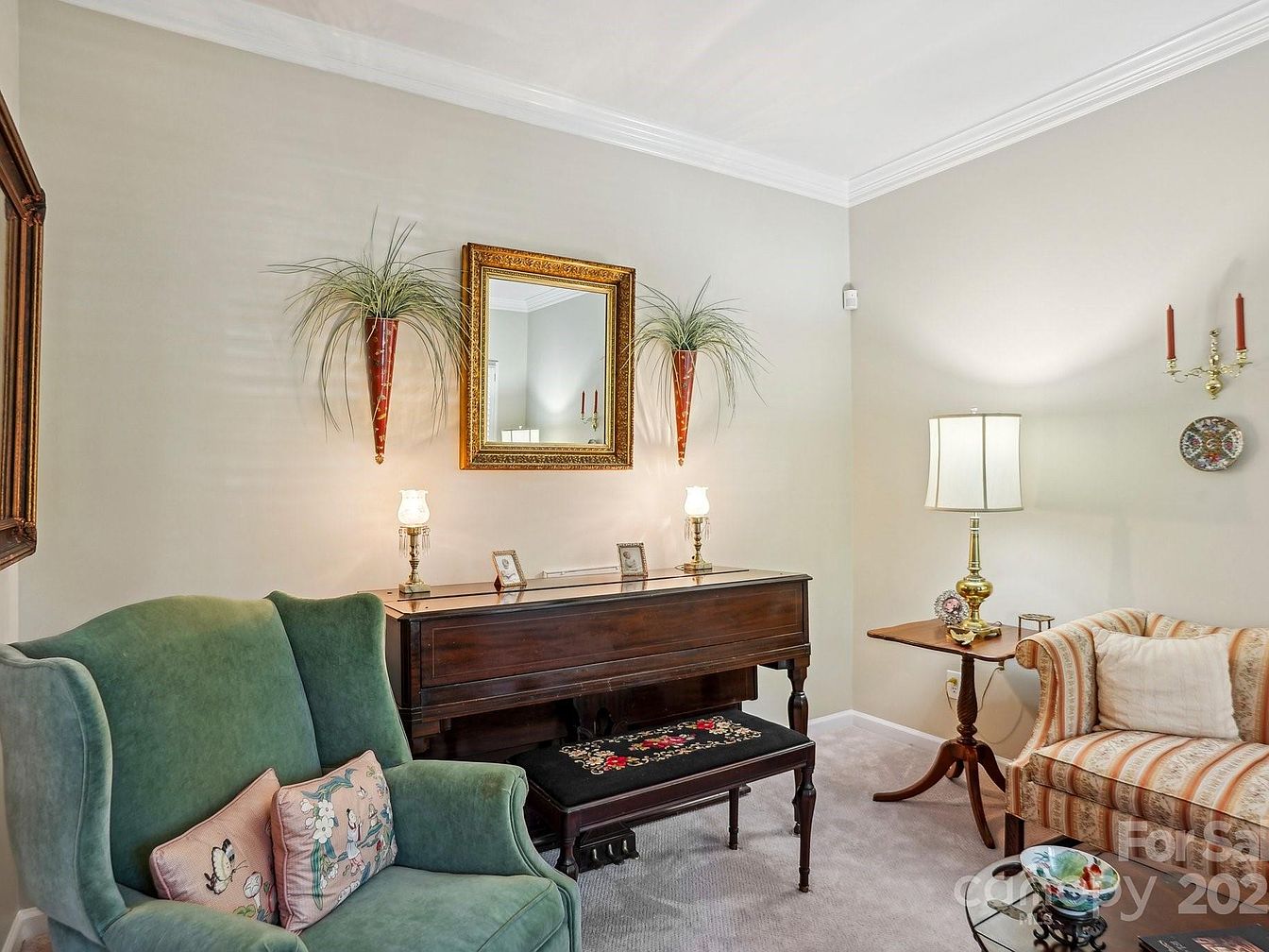 This cozy sitting room features a vintage dark wood piano as a central focal point, paired with a matching embroidered bench. A large ornate gold-framed mirror hangs above, flanked by two wall-mounted, red ornamental planters with cascading greenery, adding a natural touch to the neutral beige walls. The furniture selection includes a plush green wingback chair adorned with delicate embroidered throw pillows and a striped sofa in muted cream and peach tones, topped with a soft white cushion. A small wooden side table with a classic brass lamp completes this inviting space, evoking a sense of timeless elegance and comfort.