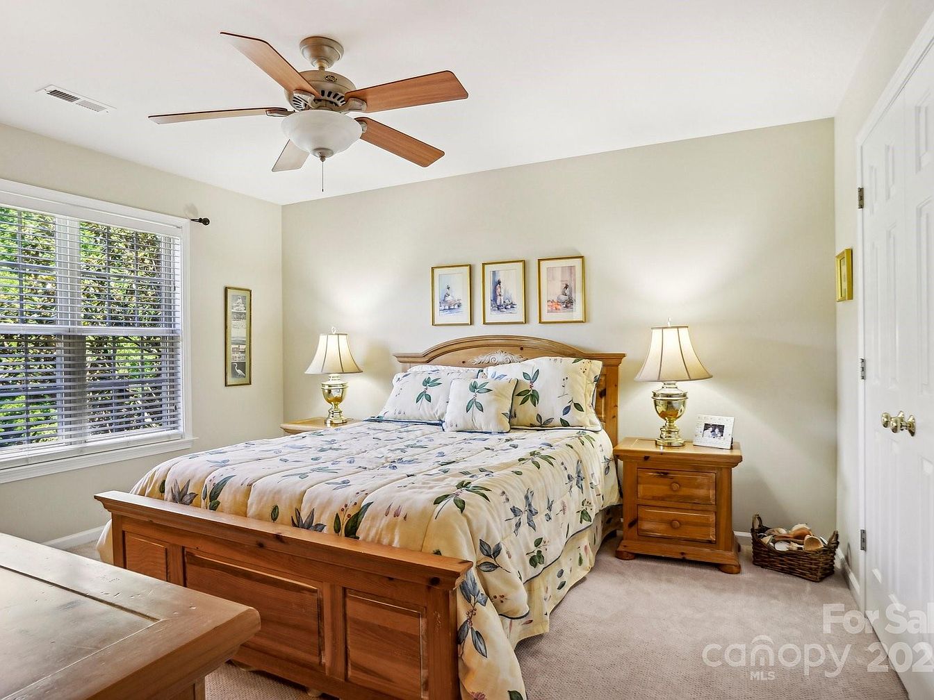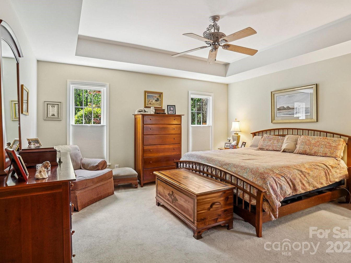 This master bedroom features a serene and inviting atmosphere with soft beige walls that complement the light carpeting. A wooden bed frame with a curved slatted headboard is fitted with a patterned bedspread in subtle earth tones. At the foot of the bed rests a sturdy wooden storage chest, perfectly matching the tall wooden dresser to the right. Two vertical windows provide ample natural light and a view of greenery outside. A comfy upholstered armchair and ottoman sit next to a large mirror on the left. A classic ceiling fan with wooden blades crowns the space, enhancing comfort and style.