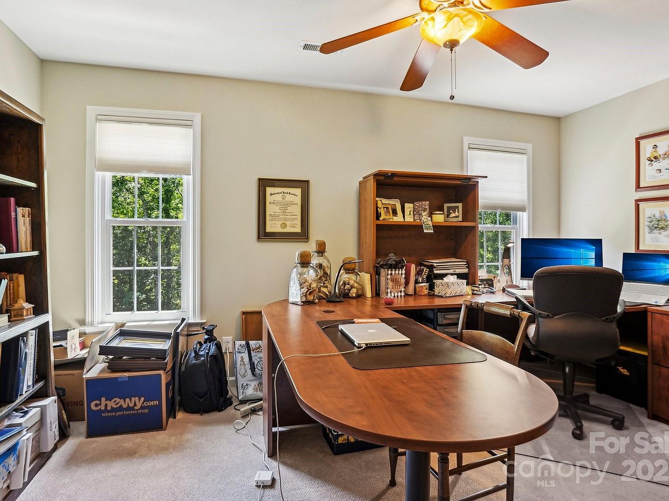 This home office features a spacious wooden L-shaped desk positioned centrally, providing ample workspace. The room is painted in a soft, neutral beige tone which complements the warm wood finish of the furniture. Two large windows with white frames and blinds invite abundant natural light while offering pleasant views of greenery outside. An ergonomic black office chair is placed by dual monitors hinting at a tech-savvy setup. A ceiling fan with wooden blades and a warm light fixture enhances comfort. Bookshelves line the walls, filled with books and personal items, giving the room a productive, cozy ambiance.