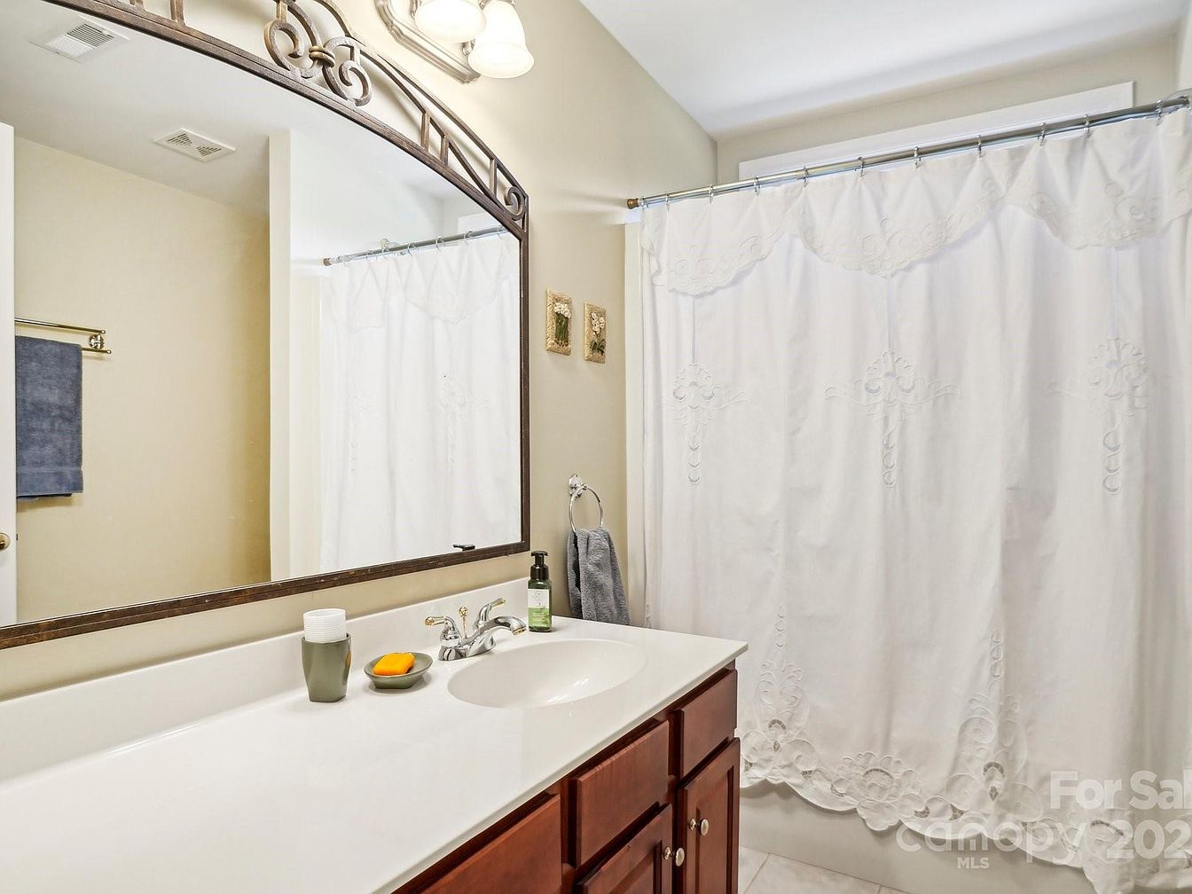 This bathroom features a spacious white countertop with an integrated sink set atop rich, dark wood cabinetry that provides ample storage. Above, a large mirror framed in dark wrought iron with elegant scrollwork enhances the sense of space and adds a hint of vintage charm. Soft lighting fixtures above the mirror cast a warm glow. A white shower curtain with delicate embroidered patterns encloses the bathtub. The walls are painted a soft beige, creating a warm, neutral backdrop that balances the contrast between the cabinetry and the pristine white surfaces. Subtle decorative accents include a gray hand towel and a small soap dish, completing this functional yet inviting bathroom environment.