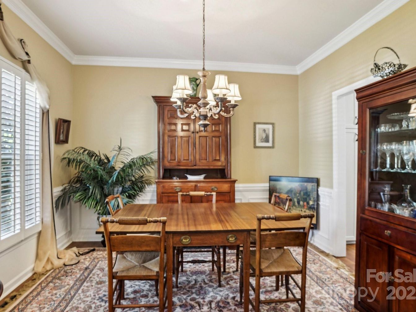 This elegant dining room features a warm beige wall color complemented by white wainscoting and crown molding that adds architectural interest. A rectangular wooden dining table with matching chairs occupies the center, surrounded by an intricate patterned area rug. A traditional wooden hutch stands against the far wall, paired with a similar china cabinet on the right filled with glassware, enhancing the classic appeal. The space benefits from natural light filtered through white plantation shutters and beige drapes. A leafy green plant brings a touch of nature, while an ornate chandelier hangs centrally, providing soft lighting.