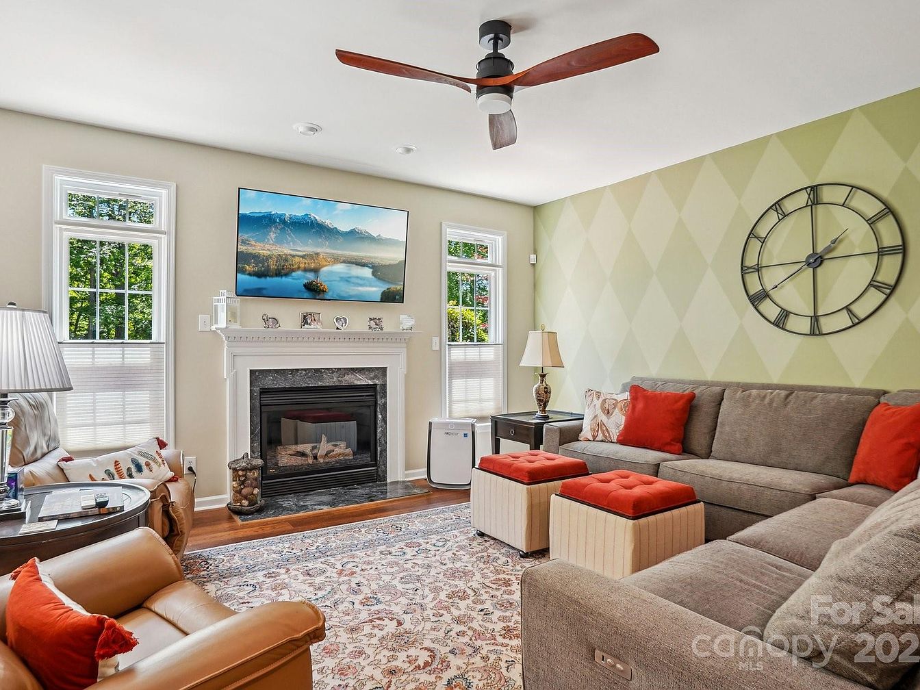 This living room presents a cozy and inviting layout centered around a classic white mantel fireplace topped with a large flat-screen TV. Flanked by two tall windows, the space is bright and airy, allowing natural light to highlight the soft beige walls and the subtle diamond-patterned green accent wall. A spacious taupe sectional sofa punctuated with burnt orange cushions faces two matching tufted ottomans, while a plush tan armchair with a colorful throw pillow completes the seating area. The hardwood floors are softened by an ornate area rug, and a modern ceiling fan with wooden blades adds a touch of contemporary elegance.