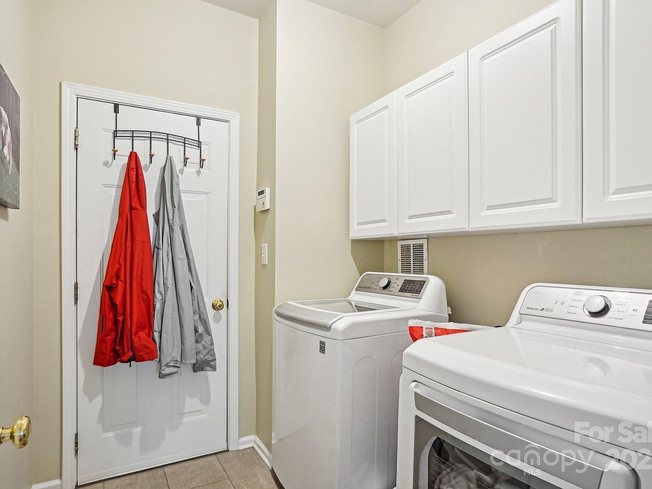 This laundry room is compact yet efficient, featuring a clean, neutral color palette with beige walls and white cabinetry. A set of white upper cabinets provides ample storage space above the washer and dryer, keeping the room organized and clutter-free. The washer and dryer are modern models, both white, complementing the cabinetry. A white interior door with a polished brass doorknob has an over-the-door rack holding a bright red jacket and a light gray jacket, adding a touch of color and functionality. The neutral tile flooring brings durability and practicality to the space.