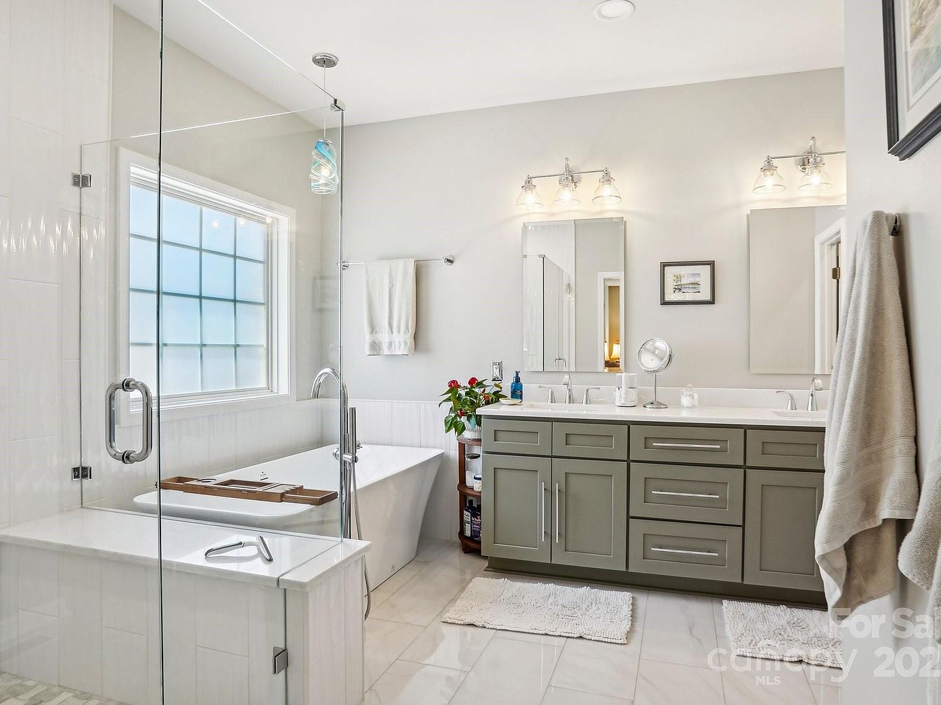 This bathroom presents a modern yet soothing design with a spacious layout. A double-sink vanity with soft olive green cabinetry offers ample storage, topped by a white countertop contrasting gently with the pastel tones. Above the vanity, two large rectangular mirrors are framed by chrome-finished light fixtures with three exposed bulbs each, providing bright, even illumination. The stand-alone white bathtub is situated beside a large frosted window that invites natural light while preserving privacy. A clear glass shower enclosure adds contemporary elegance. Marble-look floor tiles and light walls create an airy atmosphere, complemented by soft white bath mats and fluffy towels.