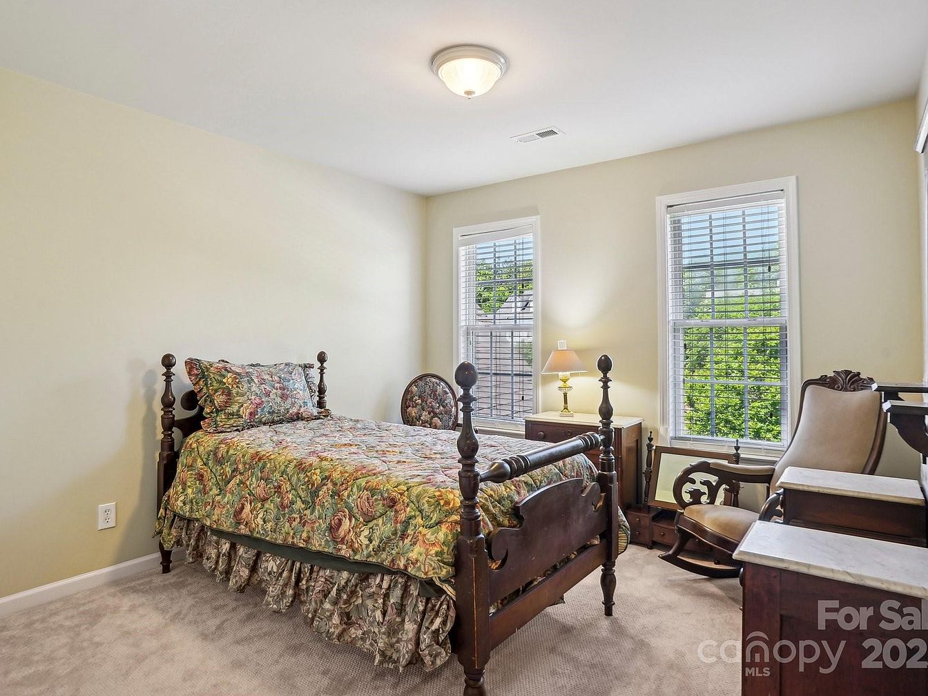 This guest bedroom features classic design elements with a warm, inviting atmosphere. The room centers around a vintage wooden bed frame with intricately turned posts, showcasing a floral quilt and matching pillow that add a touch of traditional charm. Neutral beige walls complement the soft beige carpet, providing a calm backdrop. Two tall windows with white blinds let in abundant natural light, enhancing the airy feel. Antique-style wooden furniture, including a nightstand with a brass lamp and a carved armchair, contribute to the room’s timeless aesthetic and cozy ambience.