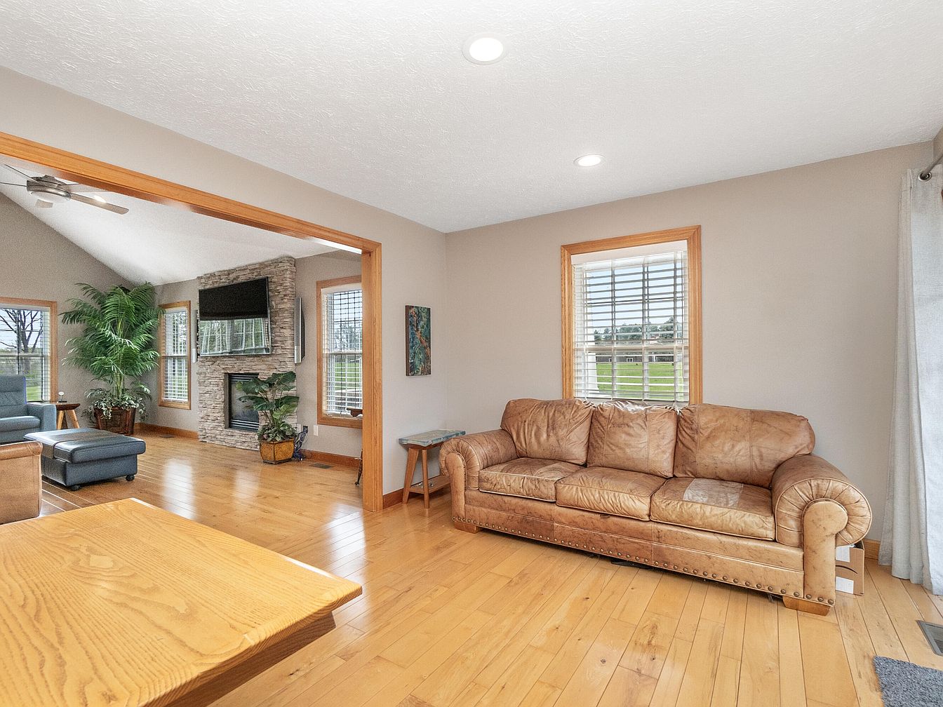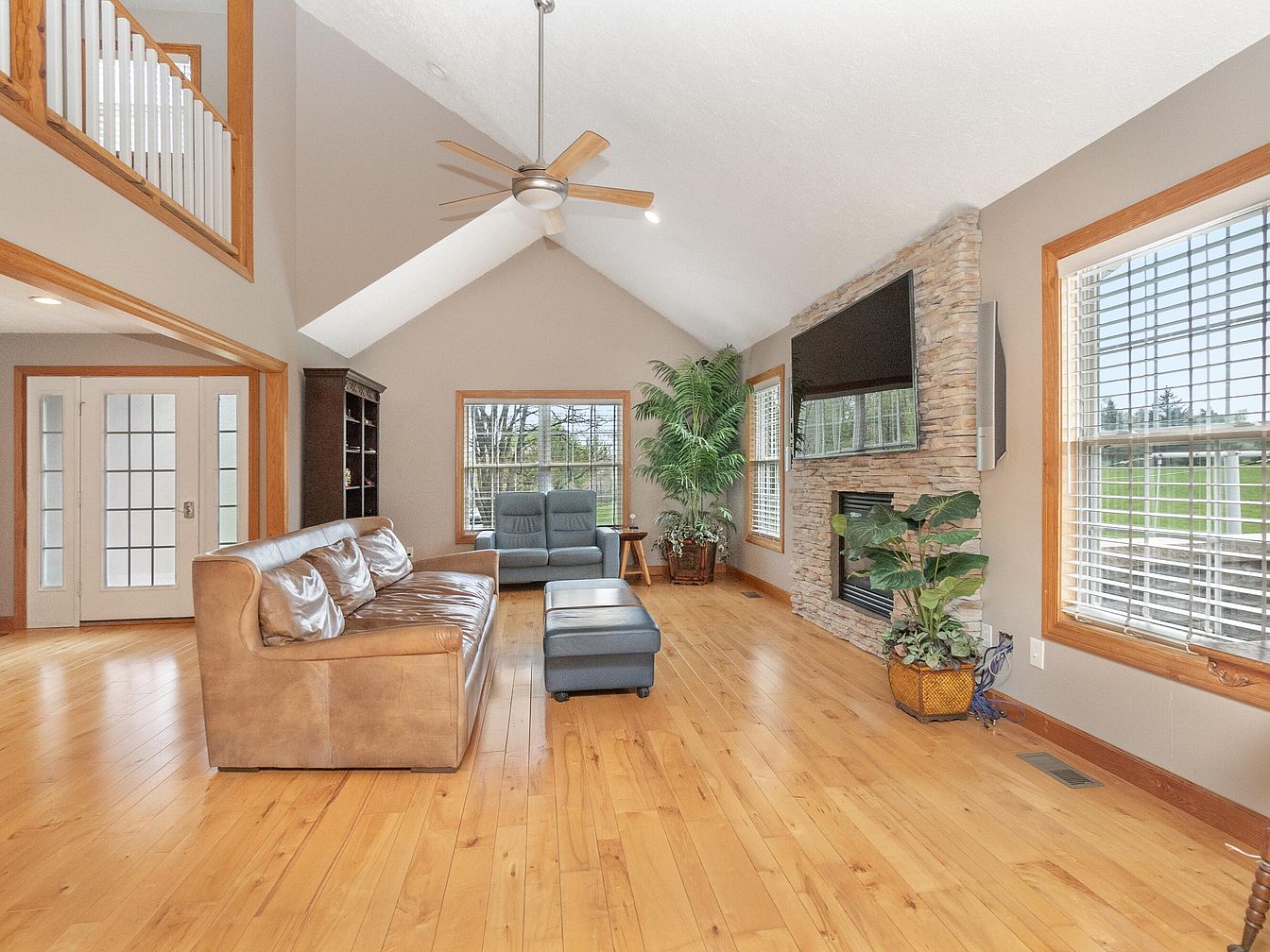 This spacious living room features vaulted ceilings with a central ceiling fan, enhancing the airy and open atmosphere. The flooring is light-toned hardwood complemented by neutral beige walls trimmed in warm wood tones. A stone fireplace anchors one wall, topped with a mounted flat-screen TV, creating a modern yet cozy focal point. Natural light floods the space through three large windows framed by wooden casings, brightening the room and offering serene outdoor views. Furnishings include a leather sofa, a blue loveseat near the window, and a pair of matching ottomans, combining comfort with style. Two lush green plants add a natural touch, enriching the tranquil, inviting ambiance.