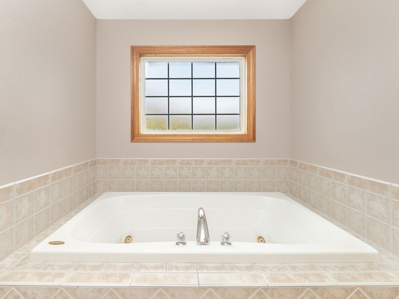 This bathroom corner features a built-in jacuzzi tub encased in beige and cream ceramic tiles that extend halfway up the neutral-toned walls. A large rectangular window with frosted panes and a natural wood frame sits directly above the tub, allowing diffused natural light to enhance the tranquil atmosphere. The tub’s chrome fixtures add a sleek, modern touch, contrasting subtly with the earthy tile pattern. The overall aesthetic is clean and understated, focusing on comfort and relaxation in a serene, light-filled space designed for unwinding.