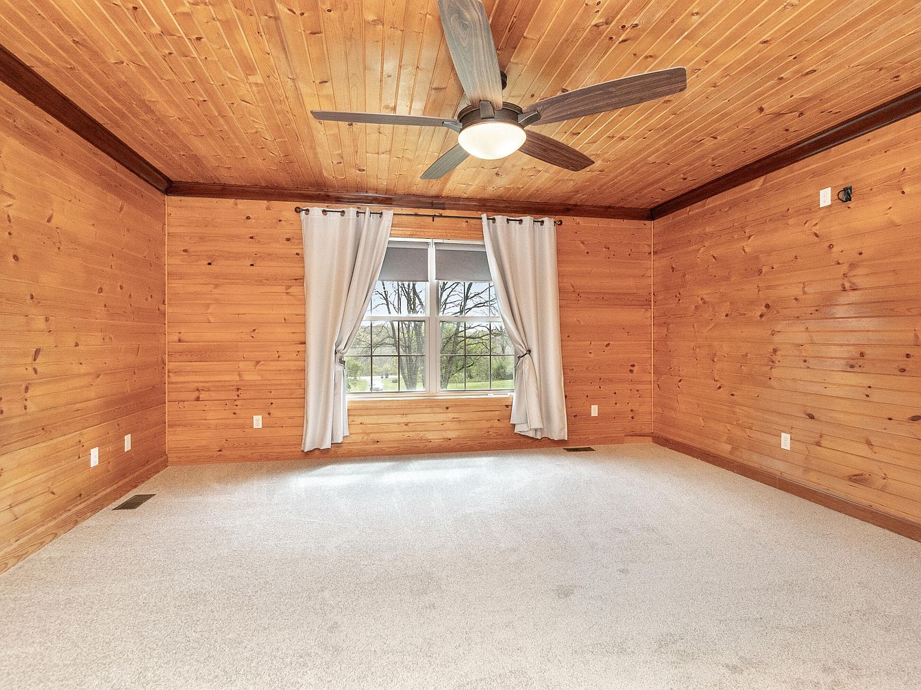This cozy bedroom features natural wood paneling on the walls and ceiling, creating a warm, cabin-like ambiance. The ceiling is accented with a darker trim molding, adding depth and definition to the space. Soft neutral-toned carpet contrasts gently with the wood’s rich honey hues, enhancing comfort underfoot. A central ceiling fan with wooden blades and a built-in light fixture balances modern functionality with rustic charm. A large window framed by simple white curtains lets in natural light and offers views of the outdoors, inviting nature inside while providing privacy and softness to the room.