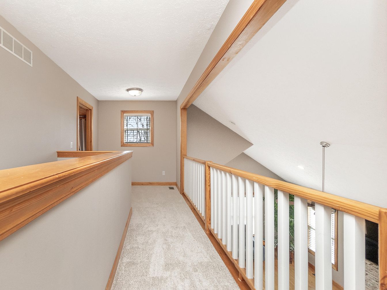 This upper hallway features a neutral color scheme with soft beige walls and light carpeting, creating a warm and inviting atmosphere. Natural wood tones highlight the trim, window frame, and railing cap, providing a cozy contrast. The space is well-lit by a ceiling-mounted light fixture, and a small window at the end offers additional natural light and a view outside. The railing with white balusters overlooks the living area below, creating an open, airy feel while maintaining safety. This transitional space connects bedrooms or other rooms, balancing functionality with subtle charm.