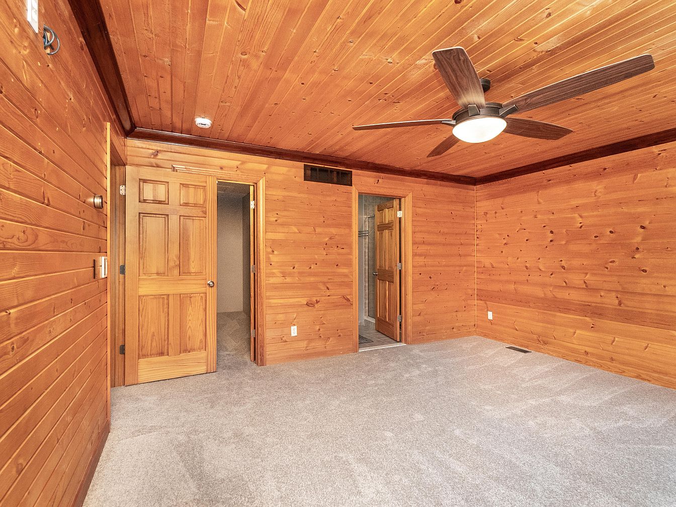 This bedroom features extensive wood paneling on the walls and ceiling, creating a warm and rustic ambiance. The natural wood tones are rich, with visible grain adding texture and character. A ceiling fan with dark wood blades hangs centrally, providing functional ventilation and complementing the wood elements. The light gray carpet softens the space, offering contrast to the warm hues while adding comfort underfoot. Two wooden doors lead to adjacent rooms, likely a closet and bathroom, enhancing the practical layout. The overall design evokes a cozy, cabin-like atmosphere.